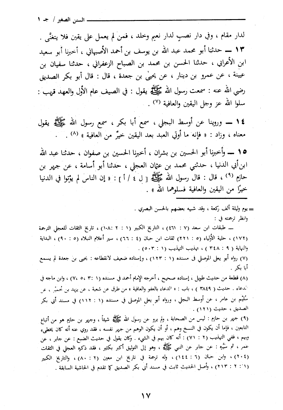 14 - وَرُوِّينَا عَنْ أَوْسَطَ الْبَجَلِيِّ، سَمِعَ أَبَا بَكْرٍ، سَمِعَ رَسُولَ اللَّهِ صَلَّى اللهُ عَلَيْهِ وَسَلَّمَ يَقُولُ: مَعْنَاهُ وَزَادَ: «فَإِنَّهُ مَا أُعْطِيَ الْعَبْدُ بَعْدَ الْيَقِينِ خَيْرًا مِنَ الْعَافِيَةِ»