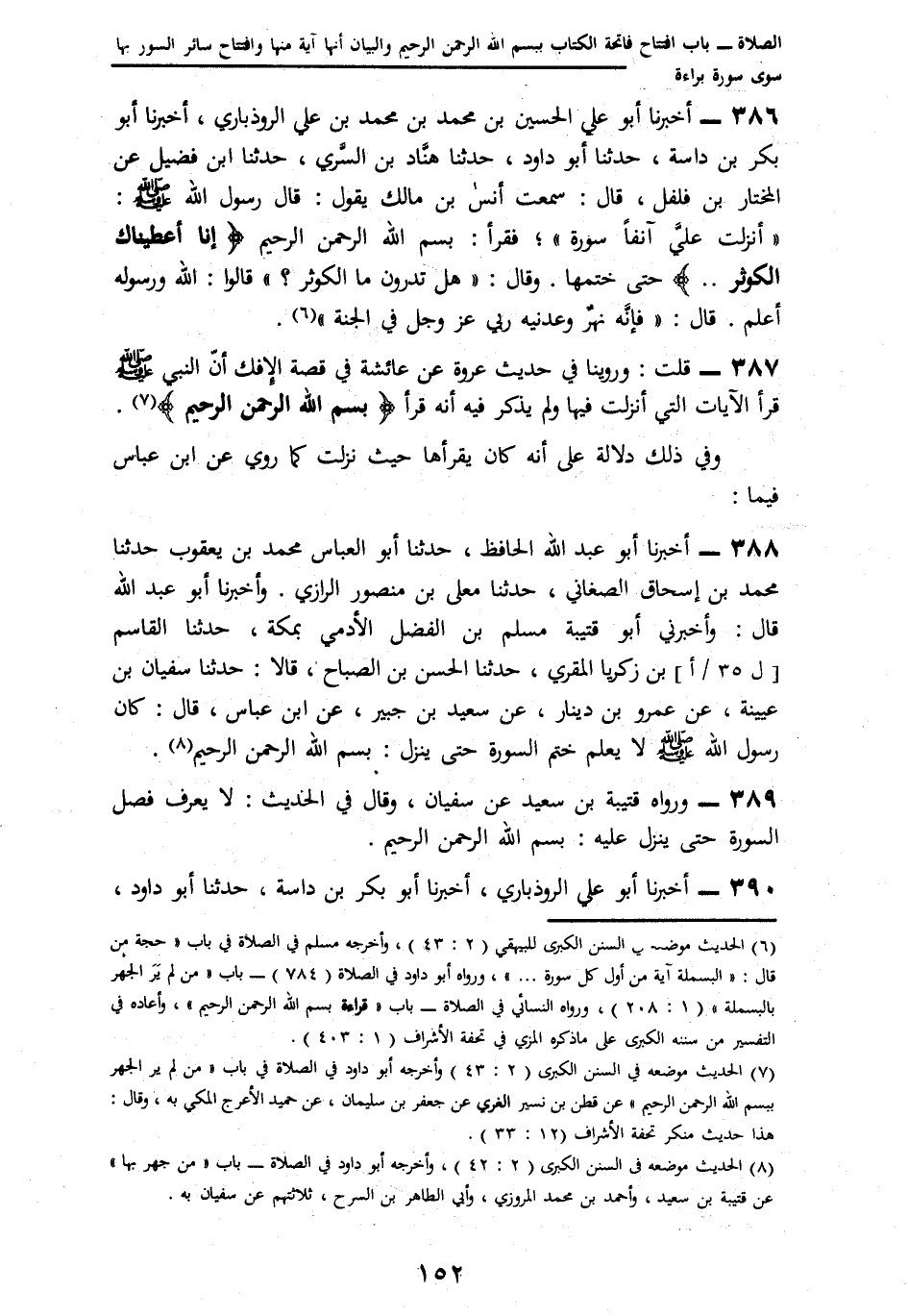 387 - قُلْتُ: وَرُوِّينَا فِي، حَدِيثِ عُرْوَةَ عَنْ عَائِشَةَ، فِي قِصَّةِ الْإِفْكِ، § «أَنَّ النَّبِيَّ صَلَّى اللهُ عَلَيْهِ وَسَلَّمَ قَرَأَ الْآيَاتِ الَّتِي نَزَلَتْ فِيهَا، وَلَمْ يَذْكُرْ فِيهِ أَنَّهُ قَرَأَ بِسْمِ اللَّهِ الرَّحْمَنِ الرَّحِيمِ، وَفِي ذَلِكَ دَلَالَةٌ عَلَى أَنَّهُ كَانَ يَقْرَؤُهَا حَيْثُ نَزَلَتْ» وَلِمَا رُوِيَ عَنِ ابْنِ عَبَّاسٍ، بِمَا