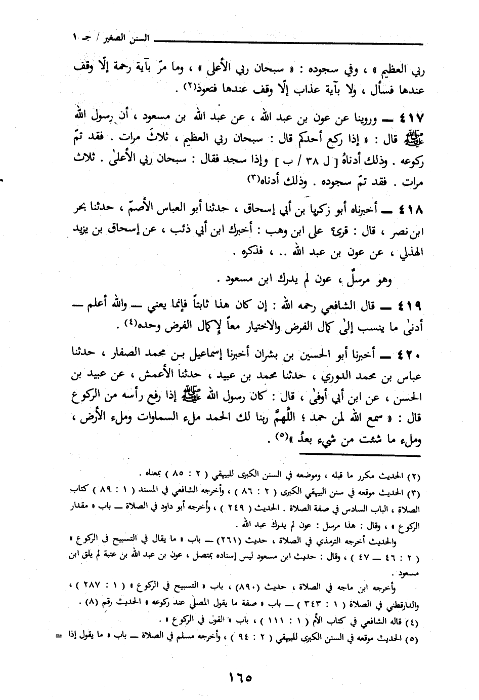 417 - وَرُوِّينَا عَنْ عَوْنِ بْنِ عَبْدِ اللَّهِ، عَنْ عَبْدِ اللَّهِ بْنِ مَسْعُودٍ، أَنَّ رَسُولَ اللَّهِ صَلَّى اللهُ عَلَيْهِ وَسَلَّمَ قَالَ: " §إِذَا رَكَعَ أَحَدُكُمْ قَالَ: سُبْحَانَ رَبِّيَ الْعَظِيمِ ثَلَاثَ مَرَّاتٍ فَقَدْ تَمَّ رُكُوعُهُ وَذَلِكَ أَدْنَاهُ، وَإِذَا سَجَدَ فَقَالَ: سُبْحَانَ رَبِّيَ الْأَعْلَى فَقَدْ تَمَّ سُجُودُهُ وَذَلِكَ أَدْنَاهُ "