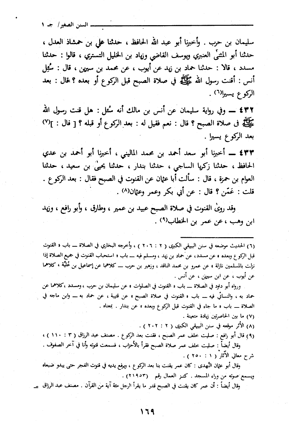 433 - أَخْبَرَنَا أَبُو سَعِيدٍ أَحْمَدُ بْنُ مُحَمَّدٍ الْمَالِينِيُّ، أنا أَبُو أَحْمَدَ بْنُ عَدِيٍّ الْحَافِظُ، نا زَكَرِيَّا السَّاجِيُّ، نا بُنْدَارٌ، نا يَحْيَى بْنُ سَعِيدٍ، نا الْعَوَّامُ بْنُ حَمْزَةَ، قَالَ: سَأَلْتُ أَبَا عُثْمَانَ عَنِ الْقُنُوتِ، فِي الصُّبْحِ فَقَالَ: " §بَعْدَ الرُّكُوعِ. قُلْتُ: عَمَّنْ؟ قَالَ: عَنْ أَبِي بَكْرٍ وَعُمَرَ وَعُثْمَانَ وَقَدْ رَوَى الْقُنُوتَ، فِي الصُّبْحِ عُبَيْدُ بْنُ عُمَيْرٍ وَطَارِقٌ وَأَبُو رَافِعٍ وَزَيْدُ بْنُ وَهْبٍ، عَنْ عُمَرَ بْنِ الْخَطَّابِ -[168]- وَرَوَاهُ عَبْدُ اللَّهِ بْنُ نَوْفَلٍ وَعَبْدُ الرَّحْمَنِ بْنُ سُوَيْدٍ الْكَاهِلِيُّ وَغَيْرُهُمَا عَنْ عَلِيِّ بْنِ أَبِي طَالِبٍ