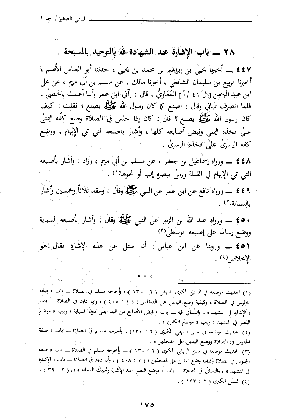 451 - وَرُوِّينَا عَنِ ابْنِ عَبَّاسٍ، أَنَّهُ " سُئِلَ عَنْ هَذِهِ الْإِشَارَةِ، فَقَالَ: §هُوَ الْإِخْلَاصُ "