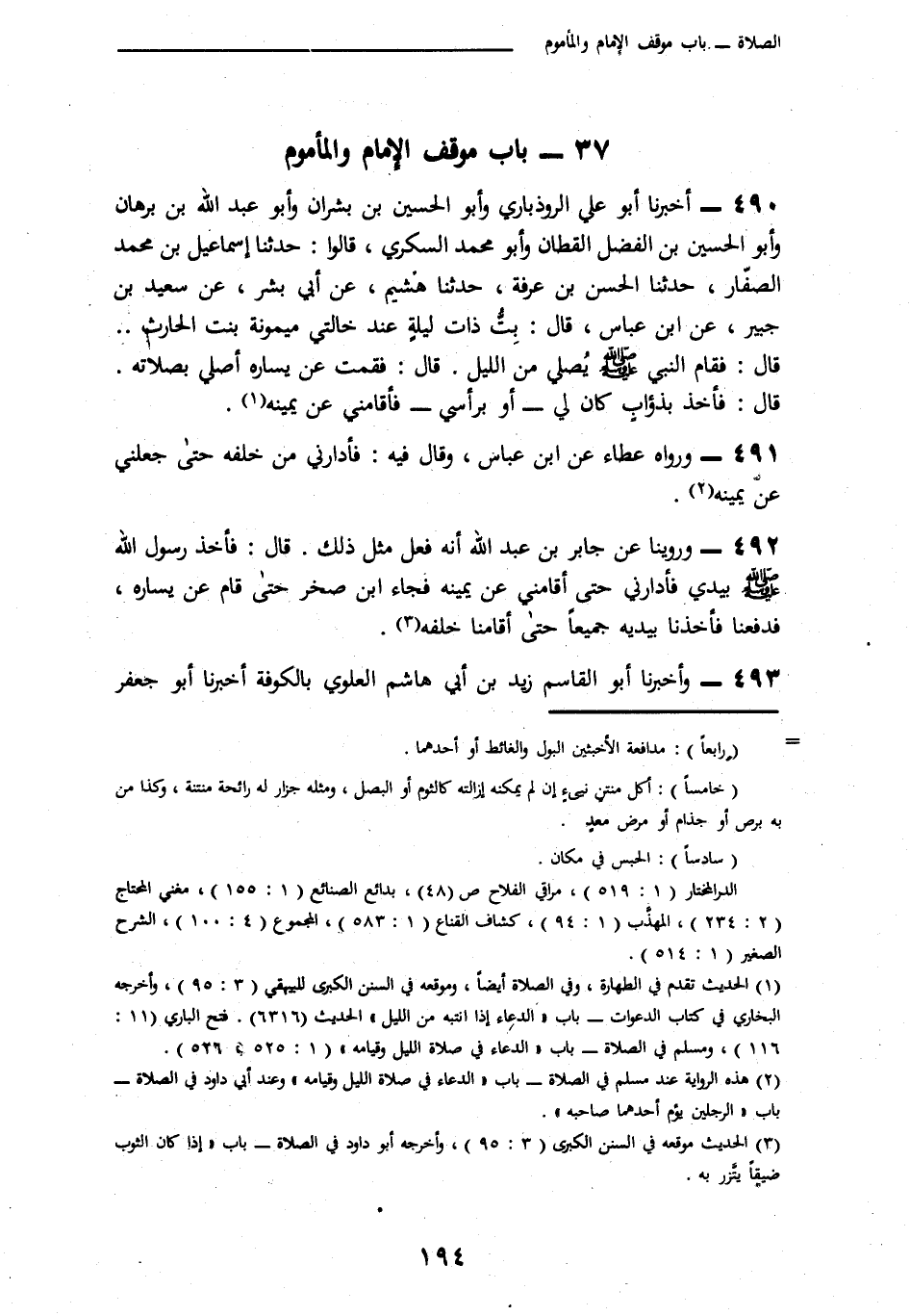 490 - أَخْبَرَنَا أَبُو عَلِيِّ الرُّوزْبَارِيُّ، وَأَبُو الْحُسَيْنِ بْنُ بِشْرَانَ، وَأَبُو عَبْدِ اللَّهِ بْنُ بُرْهَانَ، وَأَبُو الْحُسَيْنِ بْنُ الْفَضْلِ الْقَطَّانُ، وَأَبُو مُحَمَّدٍ السُّكَّرِيُّ قَالُوا: نا إِسْمَاعِيلُ بْنُ مُحَمَّدٍ الصَّفَّارُ، نا الْحَسَنُ بْنُ عَرَفَةَ، نا هُشَيْمٌ، عَنْ أَبِي بِشْرٍ، عَنْ سَعِيدِ بْنِ جُبَيْرٍ، عَنِ ابْنِ عَبَّاسٍ، قَالَ: بِتُّ ذَاتَ لَيْلَةٍ عِنْدَ خَالَتِي مَيْمُونَةَ بِنْتِ الْحَارِثِ قَالَ: " §فَقَامَ النَّبِيُّ صَلَّى اللهُ عَلَيْهِ وَسَلَّمَ يُصَلِّي مِنَ اللَّيْلِ، قَالَ: فَقُمْتُ عَنْ يَسَارِهِ أُصَلِّي بِصَلَاتِهِ " قَالَ: «فَأَخَذَ بَذُوَابٍ كَانَ لِي أَوْ بِرَأْسِي فَأَقَامَنِي عَنْ يَمِينِهِ»