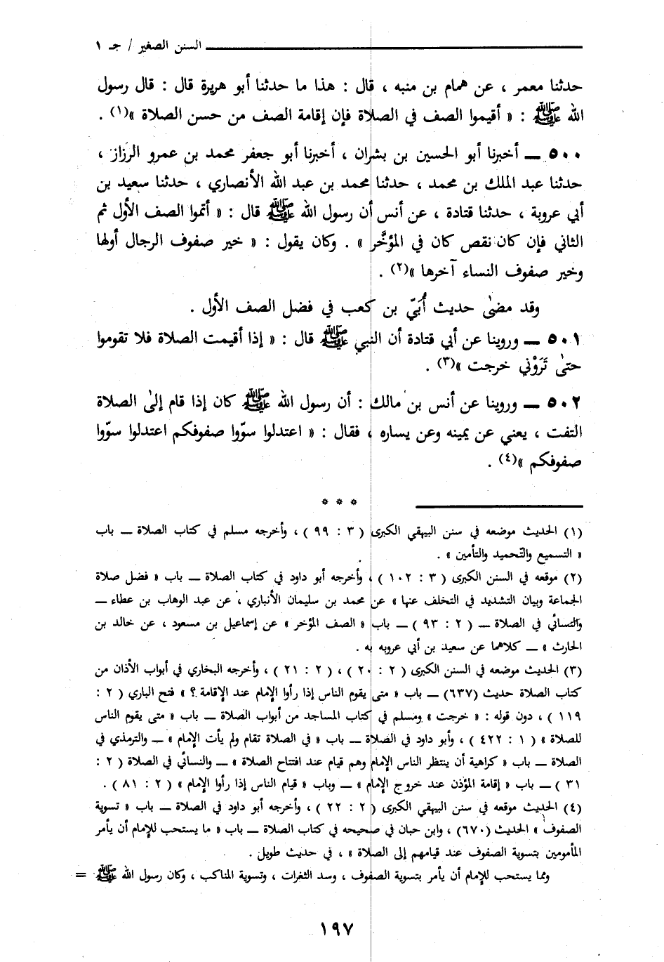 502 - وَرُوِّينَا عَنْ أَنَسِ بْنِ مَالِكٍ، أَنَّ رَسُولَ اللَّهِ صَلَّى اللهُ عَلَيْهِ وَسَلَّمَ كَانَ §إِذَا قَامَ إِلَى الصَّلَاةِ الْتَفَتَ - يَعْنِي عَنْ يَمِينِهِ وَعَنْ يَسَارِهِ - فَقَالَ: «اعْتَدِلُوا سَوُّوا صُفُوفَكُمُ اعْتَدِلُوا سَوُّوا صُفُوفَكُمْ»