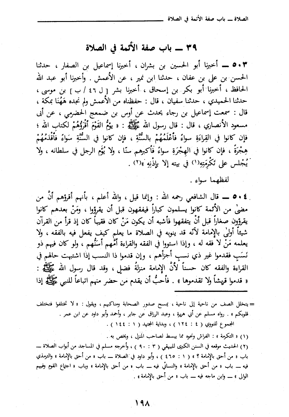 503 - أَخْبَرَنَا أَبُو الْحُسَيْنِ بْنُ بِشْرَانَ، أنا إِسْمَاعِيلُ بْنُ الصَّفَّارِ، نا الْحَسَنُ بْنُ عَلِيِّ بْنِ عَفَّانَ، نا ابْنُ نُمَيْرٍ، عَنِ الْأَعْمَشِ، وَأَخْبَرَنَا أَبُو عَبْدِ اللَّهِ الْحَافِظُ، أنا أَبُو بَكْرِ بْنُ إِسْحَاقَ، أنا بِشْرُ بْنُ مُوسَى، نا الْحُمَيْدِيُّ، نا سُفْيَانُ، قَالَ: حَفِظْنَاهُ مِنَ الْأَعْمَشِ وَلَمْ نَجِدُهُ هَهُنَا بِمَكَّةَ قَالَ: سَمِعْتُ إِسْمَاعِيلَ بْنَ رَجَاءٍ يُحَدِّثُ عَنْ أَوْسِ بْنِ ضَمْعَجِ الْحَضْرَمِيِّ، عَنْ أَبِي مَسْعُودٍ الْأَنْصَارِيِّ قَالَ: قَالَ رَسُولُ اللَّهِ صَلَّى اللهُ عَلَيْهِ وَسَلَّمَ: «§يَؤُمُ الْقَوْمَ أَقْرَؤُهُمْ لِكِتَابِ اللَّهِ، فَإِنْ كَانُوا فِي الْقِرَاءَةِ سَوَاءً فَأَعْلَمُهُمْ بِالسُّنَّةِ، فَإِنْ كَانُوا فِي السُّنَّةِ سَوَاءً فَأَقْدَمُهُمْ هِجْرَةً، فَإِنْ كَانُوا فِي الْهِجْرَةِ سَوَاءً فَأَكْبَرُهُمْ سِنًّا وَلَا يُؤَمَّ الرَّجُلُ فِي سُلْطَانِهِ وَلَا يُجْلَسْ عَلَى تَكْرِمَتِهِ فِي بَيْتِهِ إِلَّا بِإِذْنِهِ» لَفْظُهُمَا سَوَاءٌ