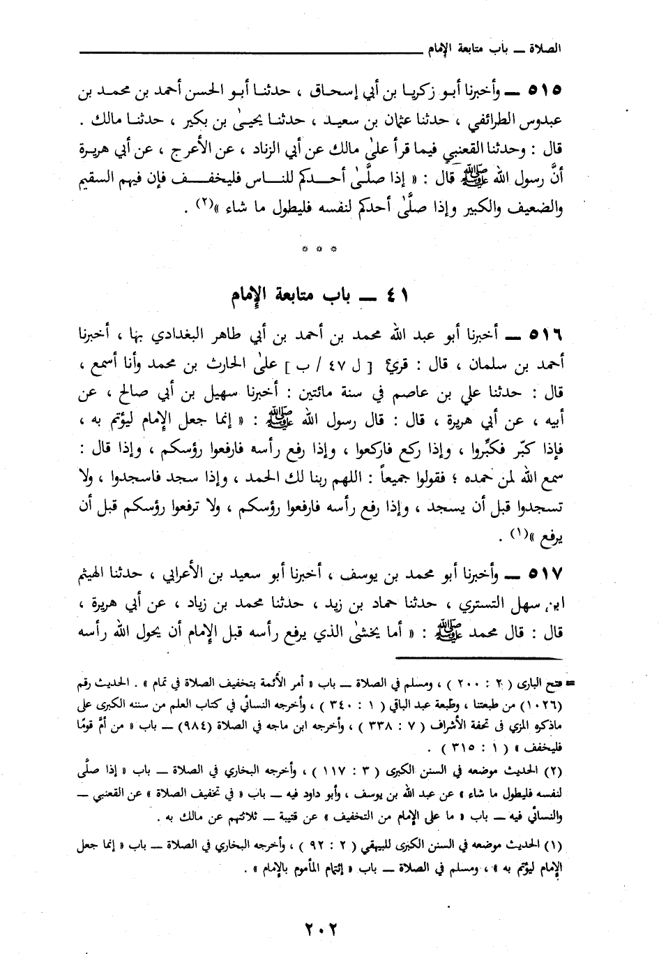 516 - أخْبَرَنَا أَبُو عَبْدِ اللَّهِ مُحَمَّدُ بْنُ أَحْمَدَ بْنِ أَبِي طَاهِرٍ الْبَغْدَادِيُّ بِهَا، أنا أَحْمَدُ بْنُ سَلْمَانَ، قَالَ: قُرِئَ عَلَى الْحَارِثِ بْنِ مُحَمَّدٍ، وَأَنَا أَسْمَعُ، قَالَ: نا عَلِيُّ بْنُ عَاصِمٍ، فِي سَنَةٍ مِائَتَيْنِ أنا سُهَيْلُ بْنُ أَبِي صَالِحٍ، عَنْ أَبِيهِ، عَنْ أَبِي هُرَيْرَةَ، قَالَ: قَالَ رَسُولُ اللَّهِ صَلَّى اللهُ عَلَيْهِ وَسَلَّمَ: " §إِنَّمَا جُعِلَ الْإِمَامُ لِيُؤْتَمَّ بِهِ، فَإِذَا كَبَّرَ فَكَبِّرُوا وَإِذَا رَكَعَ فَارْكَعُوا وَإِذَا رَفَعَ فَارْفَعُوا رُءُوسَكُمْ وَإِذَا قَالَ: سَمِعَ اللَّهُ لِمَنْ حَمِدَهُ فَقُولُوا جَمِيعًا: اللَّهُمَّ رَبَّنَا لَكَ الْحَمْدُ وَإِذَا سَجَدَ فَاسْجُدُوا وَلَا تَسْجُدُوا قَبْلَ أَنْ يَسْجُدَ وَإِذَا رَفَعَ رَأْسَهُ فَارْفَعُوا رُءُوسَكُمْ وَلَا تَرْفَعُوا رُءُوسَكُمْ قَبْلَ أَنْ يَرْفَعَ "