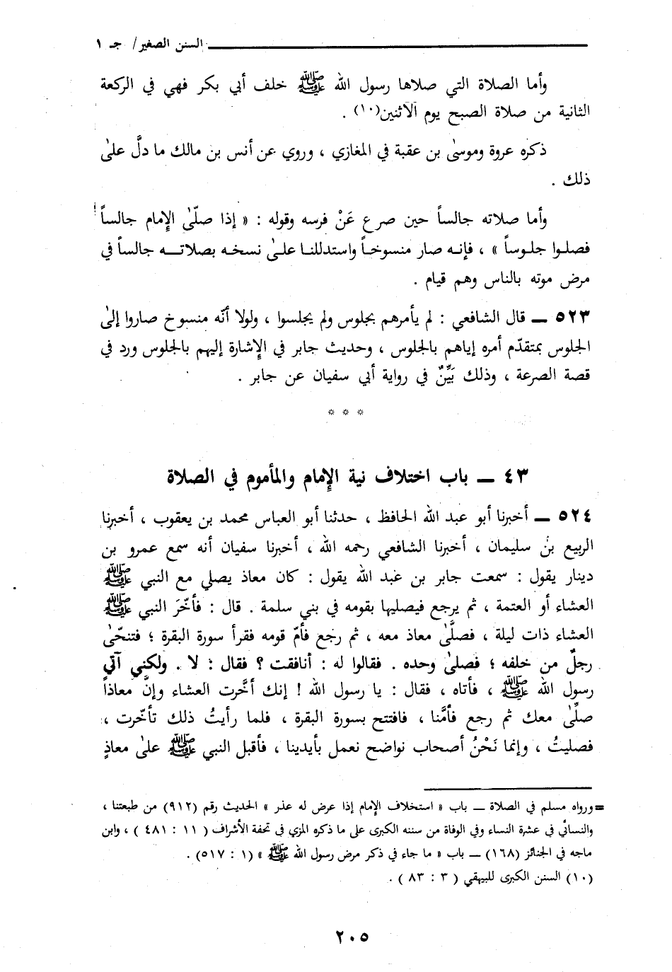 524 - أَخْبَرَنَا أَبُو عَبْدِ اللَّهِ الْحَافِظُ، نا أَبُو الْعَبَّاسِ مُحَمَّدُ بْنُ يَعْقُوبَ، أنا الرَّبِيعُ بْنُ سُلَيْمَانَ، أنا الشَّافِعِيُّ، رَحِمَهُ اللَّهُ، أَخْبَرَنَا سُفْيَانُ، أَنَّهُ سَمِعَ عَمْرَو بْنَ دِينَارٍ، يَقُولُ: سَمِعْتُ جَابِرَ بْنَ عَبْدِ اللَّهِ، يَقُولُ: كَانَ مُعَاذٌ يُصَلِّي مَعَ النَّبِيِّ صَلَّى اللهُ عَلَيْهِ وَسَلَّمَ الْعِشَاءَ أَوِ الْعَتَمَةَ، ثُمَّ يَرْجِعُ فَيُصَلِّيهَا بِقَوْمِهِ فِي بَنِي سَلَمَةَ، قَالَ: §" فَأَخَّرَ النَّبِيُّ صَلَّى اللهُ عَلَيْهِ وَسَلَّمَ الْعِشَاءَ ذَاتَ لَيْلَةٍ فَصَلَّى مُعَاذٌ مَعَهُ، ثُمَّ رَجَعَ فَأَمَّ قَوْمَهُ، فَقَرَأَ بِسُورَةِ الْبَقَرَةِ فَتَنَحَّى رَجُلٌ مِنْ خَلْفَهُ فَصَلَّى وَحْدَهُ، فَقَالُوا لَهُ: أَنَافَقْتَ؟، فَقَالَ: لَا، وَلَكِنِّي آتِي رَسُولَ اللَّهِ صَلَّى اللهُ عَلَيْهِ وَسَلَّمَ فَأَتَاهُ، فَقَالَ: يَا رَسُولَ اللَّهِ، إِنَّكَ أَخَّرْتَ الْعِشَاءَ وَإِنَّ مُعَاذًا صَلَّى مَعَكَ، ثُمَّ رَجَعَ فَأَمَّنَا فَافْتَتَحَ بِسُورَةِ الْبَقَرَةِ فَلَمَّا رَأَيْتُ ذَلِكَ تَأَخَّرْتُ فَصَلَّيْتُ وَإِنَّمَا نَحْنُ أَصْحَابُ نَوَاضِحَ نَعْمَلُ بِأَيْدِينَا فَأَقْبَلَ النَّبِيُّ صَلَّى اللهُ عَلَيْهِ وَسَلَّمَ عَلَى مُعَاذٍ -[204]- فَقَالَ: أَفَتَّانٌ أَنْتَ يَا مُعَاذُ؟ أَفَتَّانٌ أَنْتَ؟ اقْرَأْ بِسُورَةِ كَذَا وَسُورَةِ كَذَا "