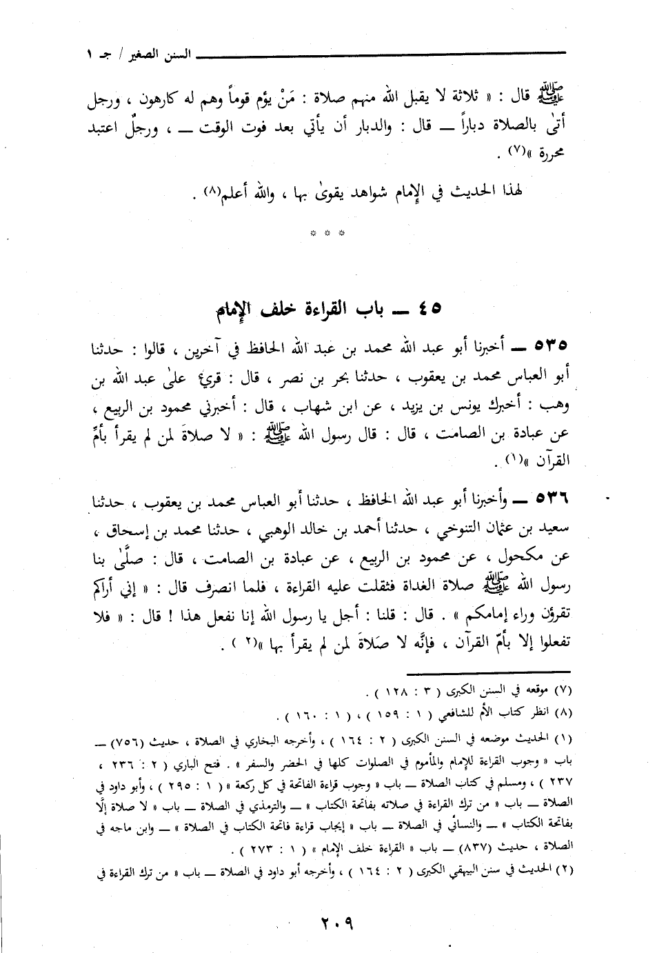 536 - وَأَخْبَرَنَا أَبُو عَبْدِ اللَّهِ الْحَافِظُ، ثنا أَبُو الْعَبَّاسِ مُحَمَّدُ بْنُ يَعْقُوبَ، نا سَعِيدُ بْنُ عُثْمَانَ التَّنُوخِيُّ، نا أَحْمَدُ بْنُ خَالِدٍ الْوَهْبِيُّ، نا مُحَمَّدُ بْنُ إِسْحَاقَ، عَنْ مَكْحُولٍ، عَنْ مَحْمُودِ بْنِ الرَّبِيعِ، عَنْ عُبَادَةَ بْنِ الصَّامِتِ، قَالَ: صَلَّى بِنَا رَسُولُ اللَّهِ صَلَّى اللهُ عَلَيْهِ وَسَلَّمَ صَلَاةَ الْغَدَاةِ فَثَقُلَتْ عَلَيْهِ الْقِرَاءَةُ فَلَمَّا انْصَرَفَ قَالَ: «§إِنِّي أَرَاكُمْ تَقْرَءُونَ وَرَاءَ إِمَامِكُمْ» قَالَ: قُلْنَا: أَجَلْ وَاللَّهِ يَا رَسُولَ اللَّهِ إِنَّا لَنَفْعَلُ هَذَا، قَالَ: «لَا تَفْعَلُوا إِلَّا بِأُمِّ الْقُرْآنِ، فَإِنَّهُ لَا صَلَاةَ لِمَنْ لَمْ يَقْرَأْ بِهَا» -[208]-