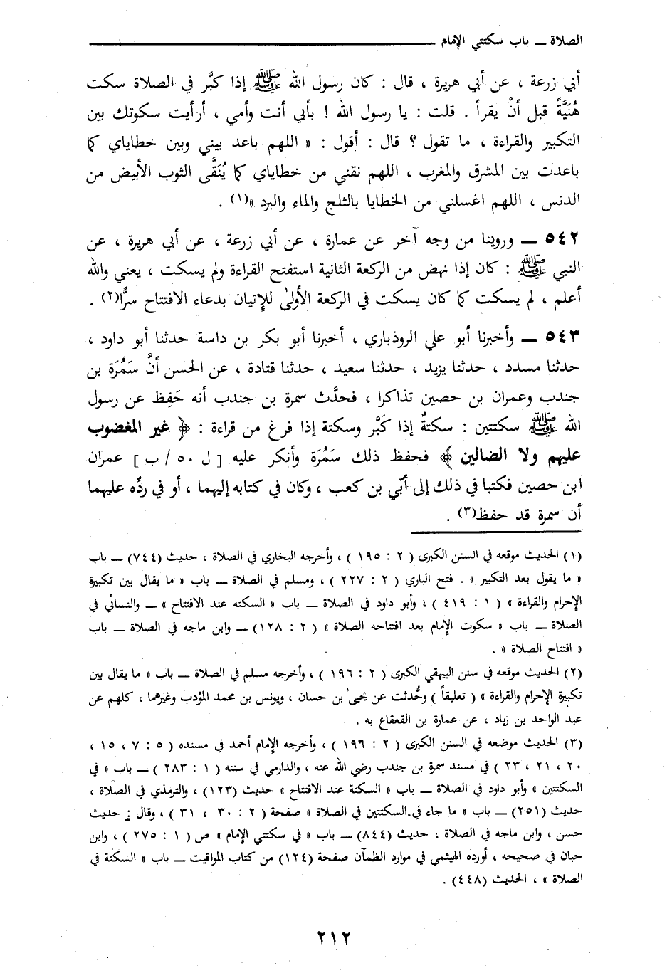 542 - وَرُوِّينَا مِنْ وَجْهٍ آخَرَ عَنْ عُمَارَةَ، عَنْ أَبِي زُرْعَةَ، عَنْ أَبِي هُرَيْرَةَ، عَنِ النَّبِيِّ صَلَّى اللهُ عَلَيْهِ وَسَلَّمَ كَانَ «§إِذَا نَهَضَ مِنَ الرَّكْعَةِ الثَّانِيَةِ اسْتَفْتَحَ الْقِرَاءَةَ وَلَمْ يَسْكُتْ، يَعْنِي وَاللَّهُ أَعْلَمُ لَمْ يَسْكُتْ كَمَا كَانَ يَسْكُتُ فِي الرَّكْعَةِ الْأُولَى لِلْإِتْيَانِ بِدُعَاءِ الِافْتِتَاحِ سِرًّا»