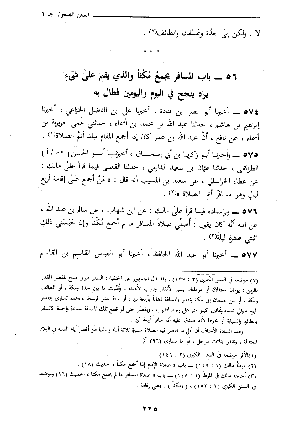 576 - وبإِسْنَادٍ فِيمَا قَرَأَ عَلَى مَالِكٍ، عَنِ ابْنِ شِهَابٍ، عَنْ سَالِمِ بْنِ عَبْدِ اللَّهِ، عَنْ أَبِيهِ، أَنَّهُ كَانَ يَقُولُ § «أُصَلِّي صَلَاةَ الْمُسَافِرِ مَا لَمْ أَجْمَعْ مُكْثًا وَإِنْ حَبَسَنِي ذَلِكَ اثْنَتَيْ عَشْرَةَ لَيْلَةً»