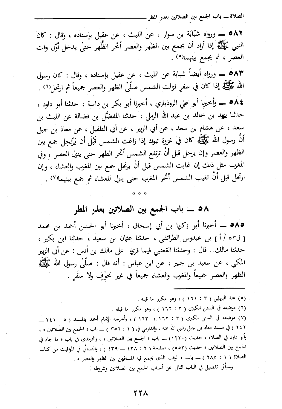 582 - وَرَوَاهُ شَبَابَةُ بْنُ سَوَّارٍ، عَنِ اللَّيْثِ، عَنْ عَقِيلٍ، بِإِسْنَادِهِ وَقَالَ: كَانَ النَّبِيُّ صَلَّى اللهُ عَلَيْهِ وَسَلَّمَ § «إِذَا أَرَادَ أَنْ يَجْمَعَ بَيْنَ الظُّهْرِ وَالْعَصْرِ أَخَّرَ الظُّهْرَ حَتَّى يَدْخُلَ أَوَّلُ وَقْتِ الْعَصْرِ، ثُمَّ يَجْمَعُ بَيْنَهُمَا»