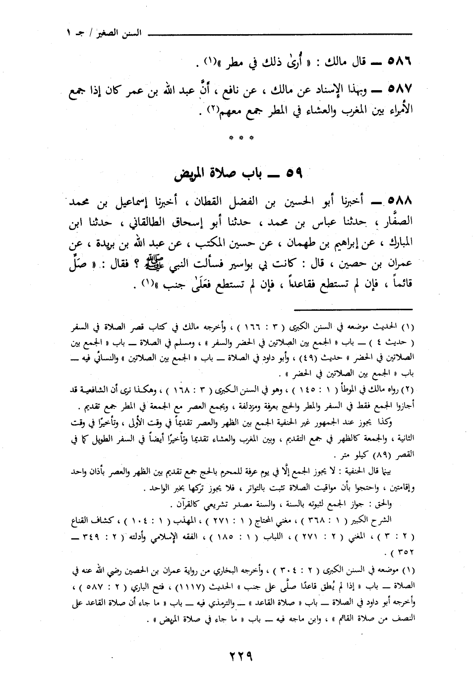 588 - أَخْبَرَنَا أَبُو الْحُسَيْنِ بْنُ الْفَضْلِ الْقَطَّانُ، أنا إِسْمَاعِيلُ بْنُ مُحَمَّدٍ الصَّفَّارُ، نا عَبَّاسُ بْنُ مُحَمَّدٍ، نا أَبُو إِسْحَاقَ الطَّالْقَانِيُّ، نا ابْنُ الْمُبَارَكِ، عَنْ إِبْرَاهِيمَ بْنِ طَهْمَانَ، عَنْ حُسَيْنٍ الْمُكْتِبِيِّ، عَنْ عَبْدِ اللَّهِ بْنِ بُرَيْدَةَ، عَنْ عِمْرَانَ بْنِ حُصَيْنٍ، قَالَ: كَانَتْ بِي بَوَاسِيرُ فَسَأَلْتُ النَّبِيَّ صَلَّى اللهُ عَلَيْهِ وَسَلَّمَ فَقَالَ: «§صَلِّ قَائِمًا، فَإِنْ لَمْ تَسْتَطِعْ فَقَاعِدًا، فَإِنْ لَمْ تَسْتَطِعْ فَعَلَى جَنْبٍ»
