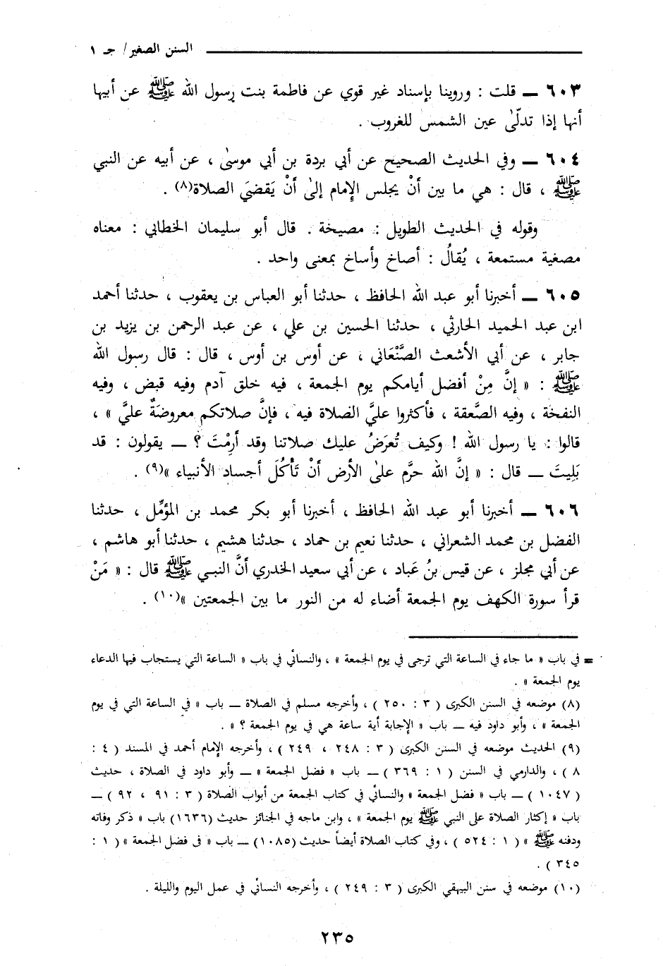 605 - أَخْبَرَنَا أَبُو عَبْدِ اللَّهِ الْحَافِظُ، نا أَبُو الْعَبَّاسِ بْنُ يَعْقُوبَ، نا أَحْمَدُ بْنُ عَبْدِ الْحَمِيدِ الْحَارِثِيُّ، نا الْحُسَيْنُ بْنُ عَلِيٍّ، عَنْ عَبْدِ الرَّحْمَنِ بْنِ يَزِيدَ بْنِ جَابِرٍ، عَنْ أَبِي الْأَشْعَثَ الصَّنْعَانِيِّ، عَنْ أَوْسِ بْنِ أَوْسٍ، قَالَ: قَالَ رَسُولُ اللَّهِ صَلَّى اللهُ عَلَيْهِ وَسَلَّمَ: «§إِنَّ مِنْ أَفْضَلِ أَيَّامِكُمْ يَوْمَ الْجُمُعَةِ فِيهِ خُلِقَ آدَمُ، وَفِيهِ قُبِضَ، وَفِيهِ النَّفْخَةُ، وَفِيهِ الصَّعْقَةُ، فَأَكْثِرُوا مِنَ الصَّلَاةِ عَلَيَّ فِيهِ، فَإِنَّ صَلَاتَكُمْ مَعْرُوضَةٌ عَلَيَّ»، قَالُوا: يَا رَسُولَ اللَّهِ، وَكَيْفَ تُعْرَضُ عَلَيْكَ صَلَاتُنَا وَقَدْ أَرَمْتَ؟ يَقُولُونَ قَدْ بَلِيتَ، قَالَ: «إِنَّ اللَّهَ حَرَّمَ عَلَى الْأَرْضِ أَنْ تَأْكُلَ أَجْسَادَ الْأَنْبِيَاءِ»