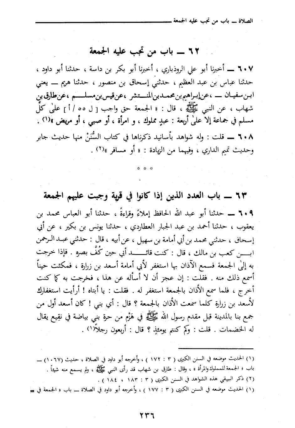 607 - أَخْبَرَنَا أَبُو عَلِيٍّ الرُّوذْبَارِيُّ، أنا أَبُو بَكْرِ بْنُ دَاسَةَ، نا أَبُو دَاوُدَ، نا عَبَّاسُ بْنُ عَبْدِ الْعَظِيمِ، حَدَّثَنِي إِسْحَاقُ بْنُ مَنْصُورٍ، نا هُرَيْمٌ يَعْنِي ابْنَ سُفْيَانَ، عَنْ إِبْرَاهِيمَ بْنِ مُحَمَّدِ بْنِ الْمُنْتَشِرِ، عَنْ قَيْسِ بْنِ مُسْلِمٍ، عَنْ طَارِقِ بْنِ شِهَابٍ، عَنِ النَّبِيِّ صَلَّى اللهُ عَلَيْهِ وَسَلَّمَ قَالَ: §" الْجُمُعَةُ حَقٌّ وَاجِبٌ عَلَى كُلِّ مُسْلِمٍ فِي جَمَاعَةٍ إِلَّا عَلَى أَرْبَعَةٍ: عَبْدٍ مَمْلُوكٍ، أَوِ امْرَأَةٍ، أَوْ صَبِيٍّ، أَوْ مَرِيضٍ "