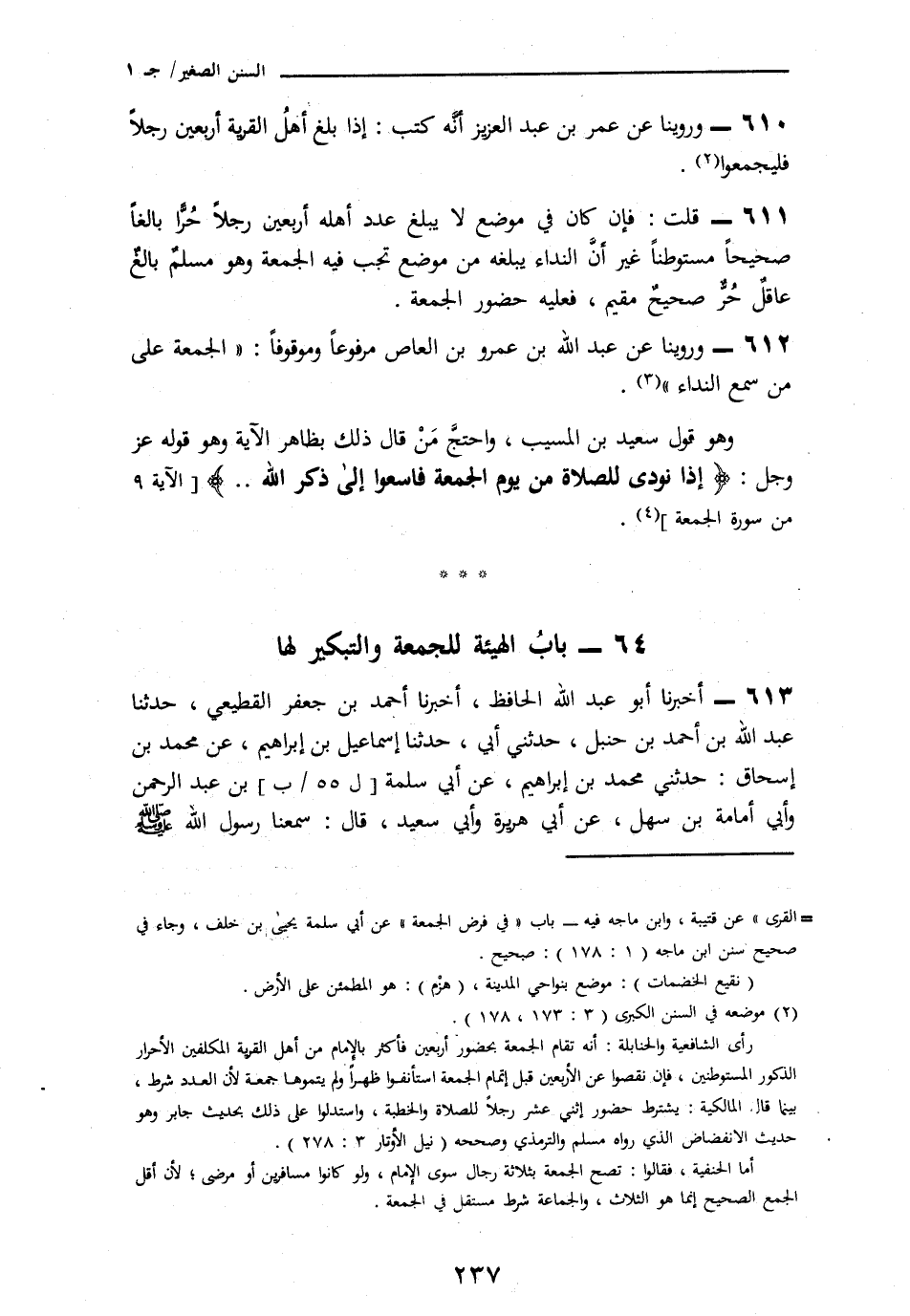 610 - وَرُوِّينَا عَنْ عُمَرَ بْنِ عَبْدِ الْعَزِيزِ، أَنَّهُ كَتَبَ «§إِذَا بَلَغَ أَهْلُ الْقَرْيَةِ أَرْبَعِينَ رَجُلًا فَلْيَجْمَعُوا»،