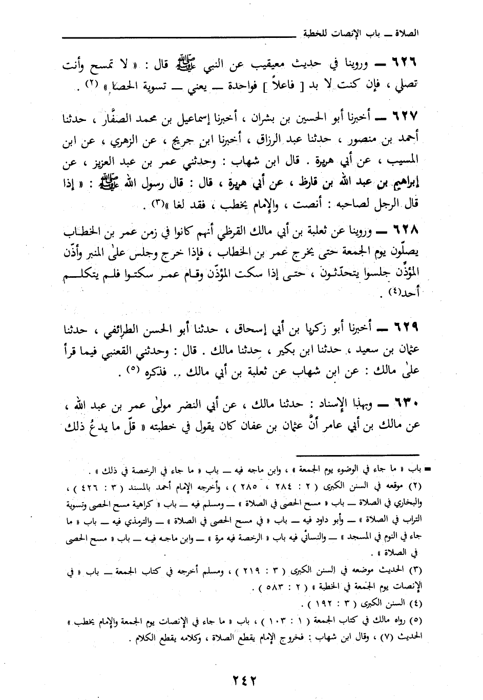 628 - وَرُوِّينَا عَنْ ثَعْلَبَةَ بْنِ أَبِي مَالِكٍ الْقُرَظِيِّ، أَنَّهُمْ كَانُوا فِي زَمَنِ عُمَرَ بْنِ الْخَطَّابِ § «يُصَلُّونَ يَوْمَ الْجُمُعَةِ حَتَّى يَخْرُجَ عُمَرُ بْنُ الْخَطَّابِ فَإِذَا خَرَجَ وَجَلَسَ عَلَى الْمِنْبَرِ وَأَذَّنَ الْمُؤَذِّنُ جَلَسُوا يَتحَدِّثُونَ حَتَّى إِذَا سَكَتَ الْمُؤَذِّنُ وَقَامَ عُمَرُ سَكَتُوا فَلَمْ يَتَكَلَّمْ أَحَدٌ»