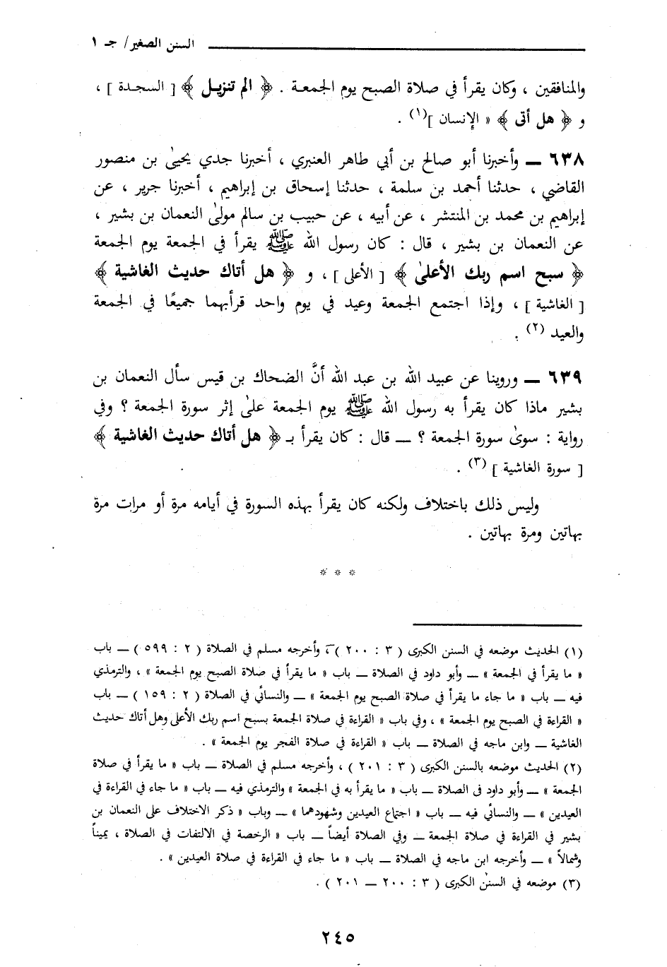 638 - وَأَخْبَرَنَا أَبُو صَالِحِ بْنُ أَبِي طَاهِرٍ الْعَنْبَرِيُّ، أنا جَدِّي يَحْيَى بْنُ مَنْصُورٍ الْقَاضِي، نا أَحْمَدُ بْنُ سَلَمَةَ، نا إِسْحَاقُ بْنُ إِبْرَاهِيمَ، أنا جَرِيرٌ، عَنْ إِبْرَاهِيمَ بْنِ مُحَمَّدِ بْنِ الْمُنْتَشِرِ، عَنْ أَبِيهِ، عَنْ حَبِيبِ بْنِ سَالِمٍ، مَوْلَى النُّعْمَانِ بْنِ بَشِيرٍ، عَنِ النُّعْمَانِ بْنِ بَشِيرٍ، قَالَ: كَانَ رَسُولُ اللَّهِ صَلَّى اللهُ عَلَيْهِ وَسَلَّمَ § «يَقْرَأُ فِي الْجُمُعَةِ يَوْمَ الْجُمُعَةِ سَبِّحِ اسْمَ رَبِّكَ الْأَعْلَى وَهَلْ أَتَاكَ حَدِيثُ الْغَاشِيَةِ وَإِذَا اجْتَمَعَ الْجُمُعَةُ وَالْعِيدُ فِي يَوْمٍ وَاحِدٍ قَرَأَ بِهِمَا جَمِيعًا فِي الْجُمُعَةِ وَالْعِيدِ»