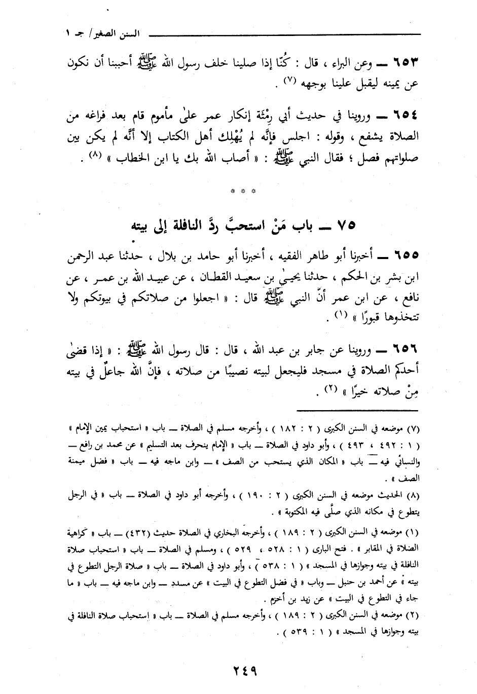 655 - أَخْبَرَنَا أَبُو طَاهِرٍ الْفَقِيهُ، أنا أَبُو حَامِدِ بْنُ بِلَالٍ، نا عَبْدُ الرَّحْمَنِ بْنُ بِشْرِ بْنِ الْحَكَمِ، نا يَحْيَى بْنُ سَعِيدٍ الْقَطَّانُ، عَنْ عُبَيْدِ اللَّهِ بْنِ عُمَرَ، عَنْ نَافِعٍ، عَنِ ابْنِ عُمَرَ، أَنَّ النَّبِيَّ صَلَّى اللهُ عَلَيْهِ وَسَلَّمَ قَالَ: § «اجْعَلُوا مِنْ صَلَاتِكُمْ فِي بُيُوتِكُمْ وَلَا تَتَّخِذُوهَا قُبُورًا»