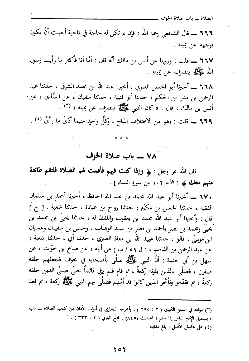 670 - أَخْبَرَنَا أَبُو عَبْدِ اللَّهِ مُحَمَّدُ بْنُ عَبْدِ اللَّهِ الْحَافِظُ، أنا أَحْمَدُ بْنُ سَلْمَانَ الْفَقِيهُ، نا الْحَسَنُ بْنُ مُكْرَمٍ، نا رَوْحُ بْنُ عُبَادَةَ، نا شُعْبَةُ، ح. قَالَ: وَأَخْبَرَنَا أَبُو عَبْدِ اللَّهِ مُحَمَّدُ بْنُ يَعْقُوبَ وَاللَّفْظُ لَهُ، نا يَحْيَى بْنُ مُحَمَّدِ بْنِ يَحْيَى، وَمُحَمَّدُ بْنُ نَصْرٍ، وَأَحْمَدُ بْنُ نَصْرِ بْنِ عَبْدِ الْوَهَّابِ، وَحَسَنُ بْنُ سُفْيَانَ، وَعِمْرَانُ بْنُ مُوسَى، قَالُوا: نا عُبَيْدُ اللَّهِ بْنُ مُعَاذٍ الْعَنْبَرِيُّ، نا أَبِي، نا شُعْبَةُ، عَنْ عَبْدِ الرَّحْمَنِ بْنِ الْقَاسِمِ، عَنْ أَبِيهِ، عَنْ صَالِحِ بْنِ خَوَّاتٍ، عَنْ سَهْلِ بْنِ أَبِي حَثْمَةَ، أَنَّ النَّبِيَّ صَلَّى اللهُ عَلَيْهِ وَسَلَّمَ «§صَلَّى بِأَصْحَابِهِ فِي الْخَوْفِ فَجَعَلَهُمْ خَلْفَهُ صَفَّيْنَ، فَصَلَّى بِالَّذِينَ يَلُونَهُ رَكْعَةً، ثُمَّ قَامَ فَلَمْ يَزَلْ قَائِمًا حَتَّى صَلَّى الَّذِي خَلْفَهُ رَكْعَةً، ثُمَّ تَقَدَّمُوا وَتَأَخَّرَ الَّذِينَ كَانُوا قَدْ أَمَّهُمْ، فَصَلَّى بِهِمُ النَّبِيُّ صَلَّى اللهُ عَلَيْهِ وَسَلَّمَ رَكْعَةً، ثُمَّ قَعَدَ -[251]- حَتَّى صَلَّى الَّذِينَ تَخَلَّفُوا رَكْعَةً، ثُمَّ سَلَّمَ»