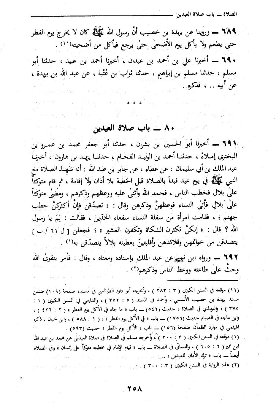 691 - أَخْبَرَنَا أَبُو الْحُسَيْنِ بْنُ بِشْرَانَ، نا أَبُو جَعْفَرٍ مُحَمَّدُ بْنُ عَمْرِو بْنِ الْبَخْتَرِيِّ إِمْلَاءً، ثنا أَحْمَدُ بْنُ الْوَلِيدِ الْفَحَّامُ، نا يَزِيدُ بْنُ هَارُونَ، أنا عَبْدُ الْمَلِكِ بْنُ أَبِي سُلَيْمَانَ، عَنْ عَطَاءٍ، عَنْ جَابِرِ بْنِ عَبْدِ اللَّهِ، لَقَدْ §شَهِدَ الصَّلَاةَ مَعَ النَّبِيِّ صَلَّى اللهُ عَلَيْهِ وَسَلَّمَ فِي يَوْمِ عِيدٍ فَبَدَأَ بِالصَّلَاةِ قَبْلَ الْخُطْبَةِ بِلَا أَذَانٍ وَلَا إِقَامَةٍ، ثُمَّ قَامَ مُتَوَكِّئًا عَلَى بِلَالٍ فَخَطَبَ النَّاسَ فَحَمِدَ اللَّهَ وَأَثْنَى عَلَيْهِ وَوَعَظَهُمْ وَذَكَّرَهُمْ وَمَضَى مُتَوَكِّئًا عَلَى بِلَالٍ فَأَتَى النِّسَاءَ فَوَعَظَهُنَّ وَذَكَّرَهُنَّ وَقَالَ: «تَصَدَّقْنَ فَإِنَّ أَكْثَرَكُنَّ حَطَبُ جَهَنَّمَ»، فَقَامَتِ امْرَأَةٌ مِنْ سَفِلَةِ النِّسَاءِ سَفْعَاءُ الْخَدَّيْنِ، فَقَالَتْ: لِمَ يَا رَسُولَ اللَّهِ؟، قَالَ: «إِنَّكُنَّ تُكْثِرْنَ الشَّكَاةَ وَتَكْفُرْنَ الْعَشِيرَ» فَجَعَلْنَ يَتَصَدَّقْنَ مِنْ خَوَاتِمِهِنَّ وَقَلَائِدِهِنَّ وَأَقْلُبَتِهِنَّ يُعْطِينَهُ بِلَالًا يَتَصَدَّقْنَ بِهِ