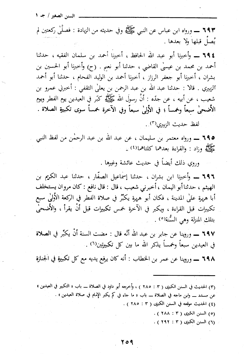 694 - وَأَخْبَرَنَا أَبُو عَبْدِ اللَّهِ الْحَافِظُ، أنا أَحْمَدُ بْنُ سَلْمَانَ الْفَقِيهُ، نا أَحْمَدُ بْنُ مُحَمَّدِ بْنِ عِيسَى الْقَاضِي، نا أَبُو نُعَيْمٍ، وَأَخْبَرَنَا أَبُو الْحُسَيْنِ بْنُ بِشْرَانَ، أنا أَبُو جَعْفَرٍ الرَّزَّازُ، أنا أَحْمَدُ بْنُ الْوَلِيدِ الْفَحَّامُ، نا أَبُو أَحْمَدَ الزُّبَيْرِيُّ، قَالَا: نا عَبْدُ اللَّهِ بْنُ عَبْدِ الرَّحْمَنِ بْنُ يَعْلَى الثَّقَفِيُّ، أَخْبَرَنِي عَمْرُو بْنُ شُعَيْبٌ، عَنْ أَبِيهِ، عَنْ جَدِّهِ، أَنَّ رَسُولَ اللَّهِ صَلَّى اللهُ عَلَيْهِ وَسَلَّمَ § «كَبَّرَ فِي الْعِيدَيْنِ يَوْمَ الْفِطْرِ وَيَوْمَ الْأَضْحَى سَبْعًا وَخَمْسًا فِي الْأُولَى سَبْعًا وَفِي الْآخِرَةِ خَمْسًا سِوَى تَكْبِيرَةِ الصَّلَاةِ» لَفْظُ حَدِيثِ الزُّبَيْرِيِّ