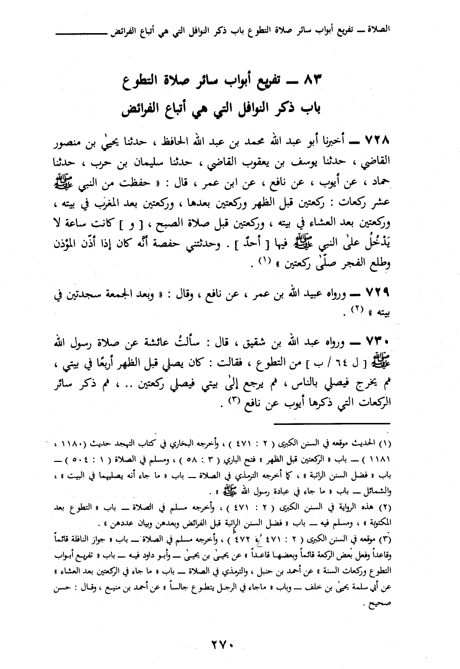 728 - أَخْبَرَنَا أَبُو عَبْدِ اللَّهِ مُحَمَّدُ بْنُ عَبْدِ اللَّهِ الْحَافِظُ، نا يَحْيَى بْنُ مَنْصُورٍ الْقَاضِي، نا يُوسُفُ بْنُ يَعْقُوبَ الْقَاضِي، نا سُلَيْمَانُ بْنُ حَرْبٍ، نا حَمَّادٌ، عَنْ أَيُّوبَ، عَنْ نَافِعٍ، عَنِ ابْنِ عُمَرَ، قَالَ: § «حَفِظْتُ مِنَ النَّبِيِّ صَلَّى اللهُ عَلَيْهِ وَسَلَّمَ عَشْرَ رَكَعَاتٍ رَكْعَتَيْنِ قَبْلَ الظُّهْرِ، وَرَكْعَتَيْنِ بَعْدَهَا، وَرَكْعَتَيْنِ بَعْدَ الْمَغْرِبِ فِي بَيْتِهِ، وَرَكْعَتَيْنِ بَعْدَ الْعِشَاءِ فِي بَيْتِهِ، وَرَكْعَتَيْنِ قَبْلَ صَلَاةِ الصُّبْحِ، وَكَانَتْ سَاعَةً لَا يَدْخُلُ عَلَى النَّبِيِّ صَلَّى اللهُ عَلَيْهِ وَسَلَّمَ فِيهَا أَحَدٌ»