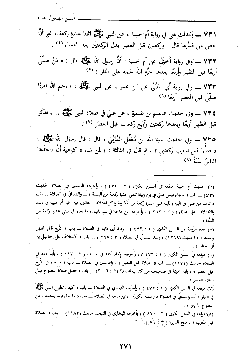 734 - وَفِي حَدِيثِ عَاصِمِ بْنِ ضَمْرَةَ، عَنْ عَلِيٍّ، فِي صَلَاةِ رَسُولِ اللَّهِ صَلَّى اللهُ عَلَيْهِ وَسَلَّمَ فَذَكَرَ «§قَبْلَ الظُّهْرِ أَرْبَعًا وَبَعْدَهَا رَكْعَتَيْنِ، وَأَرْبَعَ رَكَعَاتٍ قَبْلَ الْعَصْرِ»