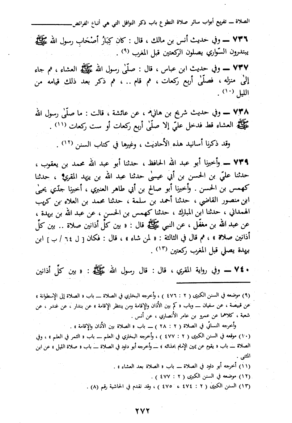 736 - وَفِي حَدِيثِ أَنَسِ بْنِ مَالِكٍ قَالَ: كَانَ نَاسٌ مِنْ أَصْحَابِ رَسُولِ اللَّهِ صَلَّى اللهُ عَلَيْهِ وَسَلَّمَ § «يَبْتَدِرُونَ السَّوَارِي يُصَلُّونَ الرَّكْعَتَيْنِ قَبْلَ الْمَغْرِبِ»
