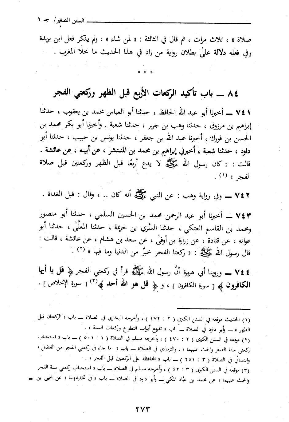 744 - وَرُوِّينَا عَنْ أَبِي هُرَيْرَةَ، أَنَّ رَسُولَ اللَّهِ صَلَّى اللهُ عَلَيْهِ وَسَلَّمَ § «قَرَأَ فِي رَكْعَتَيِ الْفَجْرِ قُلْ يَا أَيُّهَا الْكَافِرُونَ وَقُلْ هُوَ اللَّهُ أَحَدٌ»