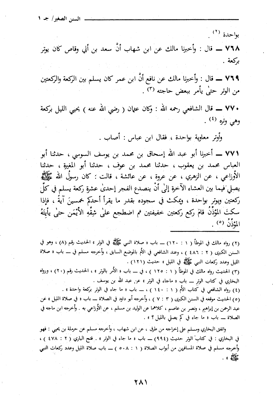770 - قَالَ الشَّافِعِيُّ رَحِمَهُ اللَّهُ: وَكَانَ عُثْمَانُ رَضِيَ اللَّهُ عَنْهُ § «يُحْيِي اللَّيْلَ بِرَكْعَةٍ وَهِيَ وِتْرٌ»