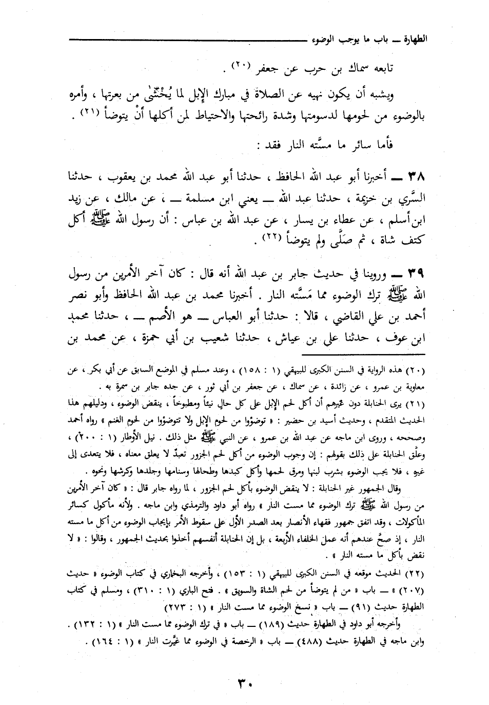 39 - وَرُوِّينَا فِي حَدِيثِ جَابِرِ بْنِ عَبْدِ اللَّهِ أَنَّهُ قَالَ: «كَانَ» آخِرَ الْأَمْرَيْنِ مِنْ رَسُولِ اللَّهِ صَلَّى اللهُ عَلَيْهِ وَسَلَّمَ تَرَكُ الْوُضُوءِ مِمَّا مَسَّتِ النَّارُ " أَخْبَرَنَا مُحَمَّدُ بْنُ عَبْدِ اللَّهِ الْحَافِظُ وَأَبُو نَصْرٍ أَحْمَدُ بْنُ عَلِيٍّ الْقَاضِي قَالَا: نا أَبُو الْعَبَّاسِ هُوَ الْأَصَمُّ، نا مُحَمَّدُ بْنُ عَوْفٍ، نا عَلِيُّ بْنُ عَيَّاشٍ، نا شُعَيْبُ بْنُ أَبِي حَمْزَةَ، عَنْ مُحَمَّدِ بْنِ -[29]- الْمُنْكَدِرِ عَنْ جَابِرٍ فَذَكَرَهُ