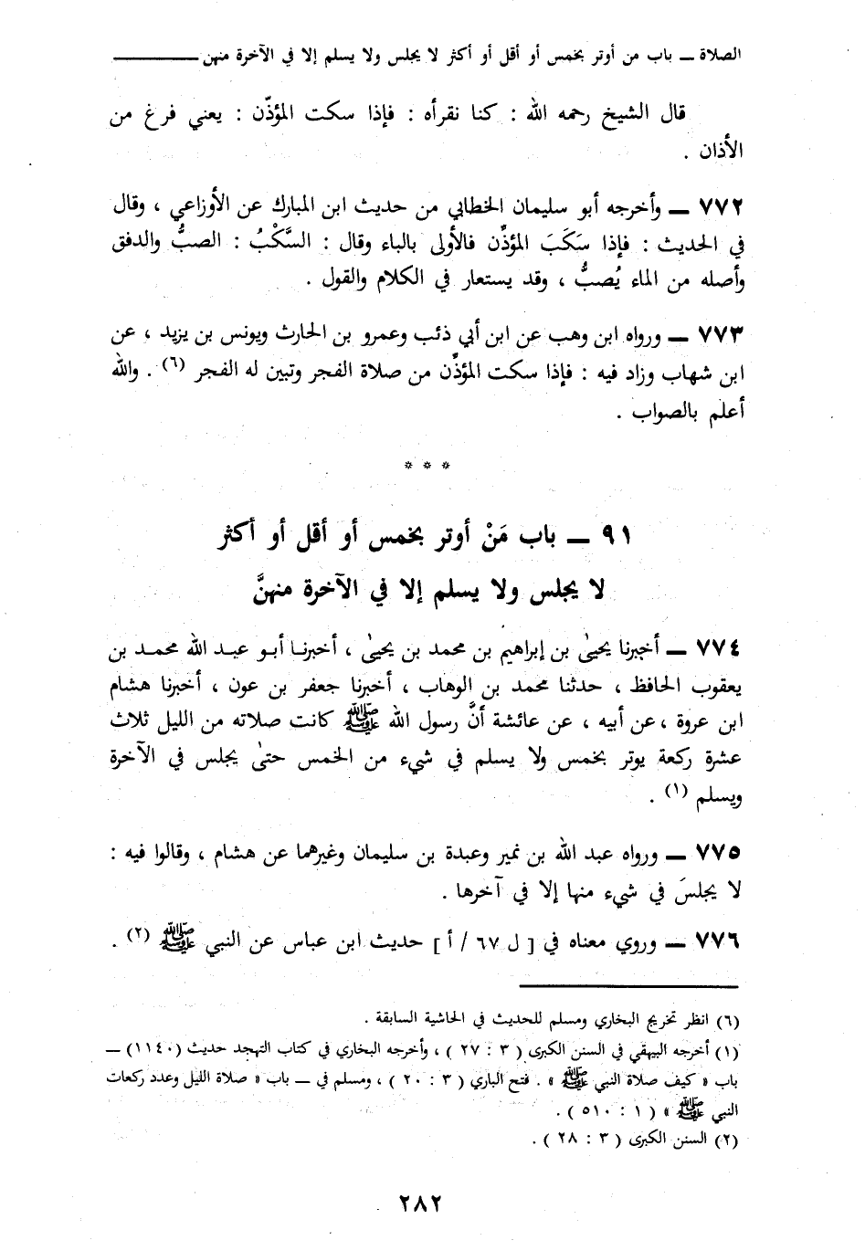 774 - أَخْبَرَنَا يَحْيَى بْنُ إِبْرَاهِيمَ بْنِ مُحَمَّدِ بْنِ يَحْيَى، أنا أَبُو عَبْدِ اللَّهِ مُحَمَّدُ بْنُ يَعْقُوبَ الْحَافِظُ، نا مُحَمَّدُ بْنُ عَبْدِ الْوَهَّابِ، أنا جَعْفَرُ بْنُ عَوْنٍ، أنا هِشَامُ بْنُ عُرْوَةَ، عَنْ أَبِيهِ، عَنْ عَائِشَةَ،: أَنَّ رَسُولَ اللَّهِ صَلَّى اللهُ عَلَيْهِ وَسَلَّمَ «§كَانَتْ صَلَاتُهُ مِنَ اللَّيْلِ ثَلَاثَ عَشْرَةَ رَكْعَةً، يُوتِرُ بِخَمْسٍ وَلَا يُسَلِّمُ فِي شَيْءٍ مِنَ الْخَمْسِ حَتَّى يَجْلِسَ فِي الْآخِرَةِ وَيُسَلِّمَ»