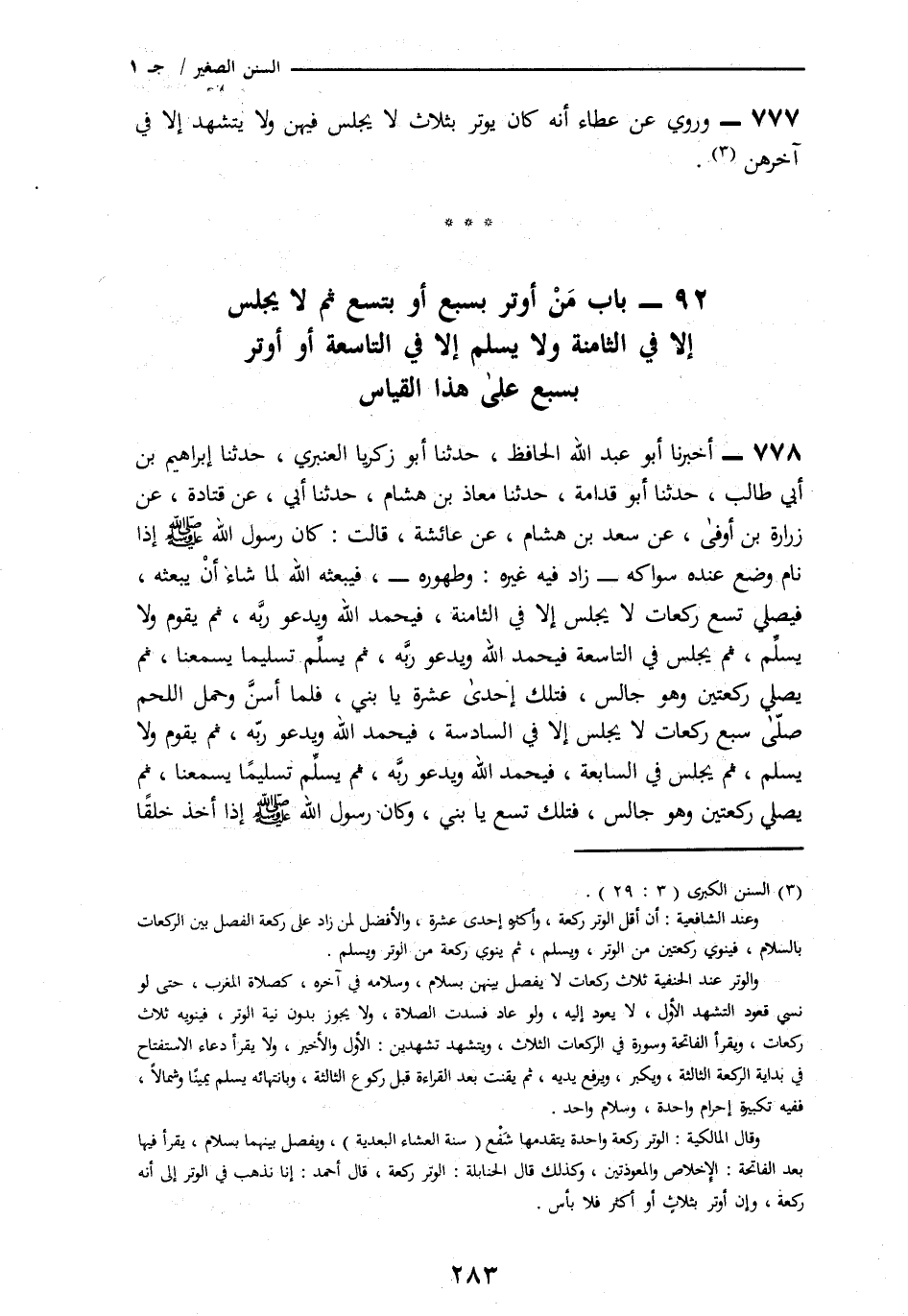 778 - أَخْبَرَنَا أَبُو عَبْدِ اللَّهِ الْحَافِظُ، نا أَبُو زَكَرِيَّا الْعَنْبَرِيُّ، نا إِبْرَاهِيمُ بْنُ أَبِي طَالِبٍ، نا أَبُو قُدَامَةَ، نا مُعَاذُ بْنُ هِشَامٍ، نا أَبِي، عَنْ قَتَادَةَ، عَنْ زُرَارَةَ بْنِ أَوْفَى، عَنْ سَعْدِ بْنِ هِشَامٍ، عَنْ عَائِشَةَ، قَالَتْ: كَانَ رَسُولُ اللَّهِ صَلَّى اللهُ عَلَيْهِ وَسَلَّمَ «§إِذَا نَامَ وَضَعَ عِنْدَهُ سِوَاكَهُ»، زَادَ فِيهِ غَيْرُهُ: «وَطَهُورَهُ، فَيَبْعَثُهُ اللَّهُ لِمَا شَاءَ أَنْ يَبْعَثَهُ فَيُصَلِّي تِسْعَ رَكَعَاتٍ لَا يَجْلِسُ إِلَّا فِي الثَّامِنَةِ فَيَحْمَدُ اللَّهَ وَيَدْعُو رَبَّهُ ثُمَّ يَقُومُ وَلَا يُسَلِّمُ ثُمَّ يَجْلِسُ فِي التَّاسِعَةِ فَيَحْمَدُ اللَّهَ وَيَدْعُو رَبَّهُ، ثُمَّ يُسَلِّمُ تَسْلِيمًا يُسْمِعُنَا، ثُمَّ يُصَلِّي رَكْعَتَيْنِ وَهُوَ جَالِسٌ فَتِلْكَ إِحْدَى عَشْرَةَ يَا بُنَيَّ، فَلَمَّا أَسَنَّ رَسُولُ اللَّهِ وَأَخَذَ اللَّحْمَ صَلَّى سَبْعَ رَكَعَاتٍ لَا يَجْلِسُ إِلَّا فِي السَّادِسَةِ فَيَحْمَدُ اللَّهَ وَيَدْعُو رَبَّهُ، ثُمَّ يَقُومُ وَلَا يُسَلِّمُ ثُمَّ يَجْلِسُ فِي السَّابِعَةِ فَيَحْمَدُ اللَّهَ وَيَدْعُو رَبَّهُ، ثُمَّ يُسَلِّمُ تَسْلِيمًا يُسْمِعُنَا، ثُمَّ يُصَلِّي رَكْعَتَيْنِ وَهُوَ جَالِسٌ فَتِلْكَ تِسْعٌ يَا بُنَيَّ، وَكَانَ رَسُولُ اللَّهِ صَلَّى اللهُ عَلَيْهِ وَسَلَّمَ إِذَا أَخَذَ خُلُقًا أَحَبَّ -[282]- أَنْ يُدَاوِمَ عَلَيْهِ، وَكَانَ إِذَا غَلَبَهُ نَوْمٌ أَوْ مَرَضٌ صَلَّى ثِنْتَيْ عَشْرَةَ رَكْعَةً مِنَ النَّهَارِ وَمَا قَامَ نَبِيُّ اللَّهِ صَلَّى اللهُ عَلَيْهِ وَسَلَّمَ لَيْلَةً حَتَّى يُصْبِحَ وَلَا صَامَ شَهْرًا كَامِلًا غَيْرَ رَمَضَانَ» وَهَذَا فِي حَدِيثٍ فِيهِ طُولٌ وَكُلُّ هَذِهِ الْأَنْوَاعِ مِنَ الْوِتْرِ جَائِزَةٌ عِنْدَنَا وَكَانَ رَسُولُ اللَّهِ صَلَّى اللهُ عَلَيْهِ وَسَلَّمَ يَفْعَلُهَا عَلَى مَرِّ اللَّيَالِي