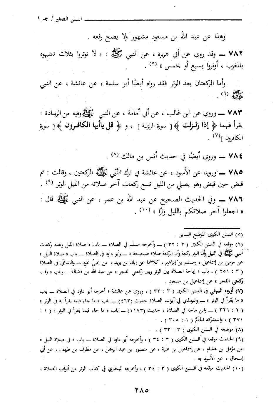 785 - وَرُوِّينَا عَنِ الْأَسْوَدِ، عَنْ عَائِشَةَ «فِي §تَرْكِ النَّبِيِّ صَلَّى اللهُ عَلَيْهِ وَسَلَّمَ الرَّكْعَتَيْنِ» وَقَالَتْ: ثُمَّ قُبِضَ حِينَ قُبِضَ وَهُوَ يُصَلِّي مِنَ اللَّيْلِ تِسْعَ رَكَعَاتٍ آخِرَ صَلَاتِهِ مِنَ اللَّيْلِ الْوِتْرُ
