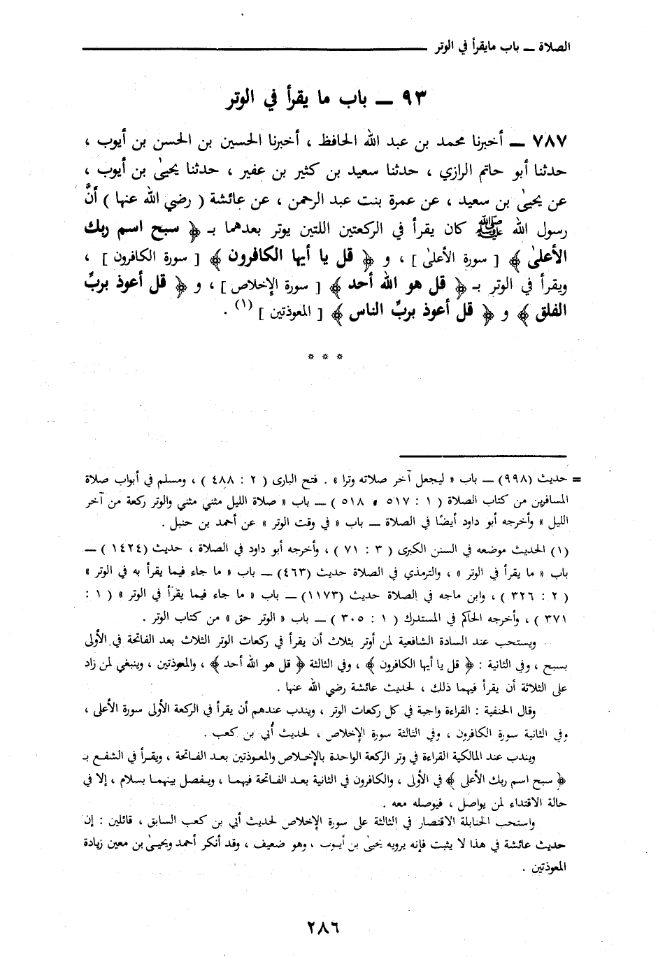 787 - أَخْبَرَنَا مُحَمَّدُ بْنُ عَبْدِ اللَّهِ الْحَافِظُ، أنا الْحُسَيْنُ بْنُ الْحَسَنِ بْنِ أَيُّوبَ، نا أَبُو حَاتِمٍ الرَّازِيُّ، نا سَعِيدُ بْنُ كَثِيرِ بْنِ عُفَيْرٍ، نا يَحْيَى بْنُ أَيُّوبَ، عَنْ يَحْيَى بْنِ سَعِيدٍ، عَنْ عَمْرَةَ بِنْتِ عَبْدِ الرَّحْمَنِ، عَنْ عَائِشَةَ رَضِيَ اللَّهُ عَنْهَا أَنَّ رَسُولَ اللَّهِ صَلَّى اللهُ عَلَيْهِ وَسَلَّمَ كَانَ § «يَقْرَأُ فِي الرَّكْعَتَيْنِ اللَّتَيْنِ يُوتِرُ بَعْدَهُمَا بِسَبِّحِ اسْمَ رَبِّكَ الْأَعْلَى وَقُلْ يَا أَيُّهَا الْكَافِرُونَ، وَيَقْرَأُ فِي الْوِتْرِ بِقُلْ هُوَ اللَّهُ أَحَدٌ، وَقُلْ أَعُوذُ بِرَبِّ الْفَلَقِ، وَقُلْ أَعُوذُ بِرَبِّ النَّاسِ»