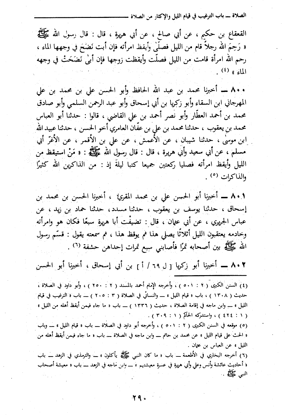 800 - أَخْبَرَنَا مُحَمَّدُ بْنُ عَبْدِ اللَّهِ الْحَافِظُ، وَأَبُو الْحَسَنِ عَلِيُّ بْنُ مُحَمَّدِ بْنِ عَلِيٍّ الْمِهْرَجَانِيُّ بْنُ السَّقَّاءِ، وَأَبُو زَكَرِيَّا بْنُ أَبِي إِسْحَاقَ، وَأَبُو عَبْدِ الرَّحْمَنِ السُّلَمِيُّ، وَأَبُو صَادِقٍ مُحَمَّدُ بْنُ أَحْمَدَ الْعَطَّارُ، وَأَبُو نَصْرٍ أَحْمَدُ بْنُ عَلِيٍّ الْقَاضِي قَالُوا: نا أَبُو الْعَبَّاسِ مُحَمَّدُ بْنُ يَعْقُوبَ، نا مُحَمَّدُ بْنُ عَلِيِّ بْنِ عَفَّانَ الْعَامِرِيُّ، أَخُو الْحَسَنِ، نا عُبَيْدُ اللَّهِ بْنُ مُوسَى، نا شَيْبَانُ، عَنِ الْأَعْمَشِ، عَنْ عَلِيِّ بْنِ الْأَقْمَرِ، عَنِ الْأَغَرِّ أَبِي مُسْلِمٍ، عَنْ أَبِي سَعِيدٍ، وَأَبِي هُرَيْرَةَ، قَالَ: قَالَ رَسُولُ اللَّهِ صَلَّى اللهُ عَلَيْهِ وَسَلَّمَ: § «مَنِ اسْتَيْقَظَ مِنَ اللَّيْلِ فَأَيْقَظَ أَهْلَهُ فَصَلَّيَا رَكْعَتَيْنِ جَمِيعًا كُتِبَ لَيْلَتَئِذٍ مِنَ الذَّاكِرِينَ اللَّهَ كَثِيرًا وَالذَّاكِرَاتِ»