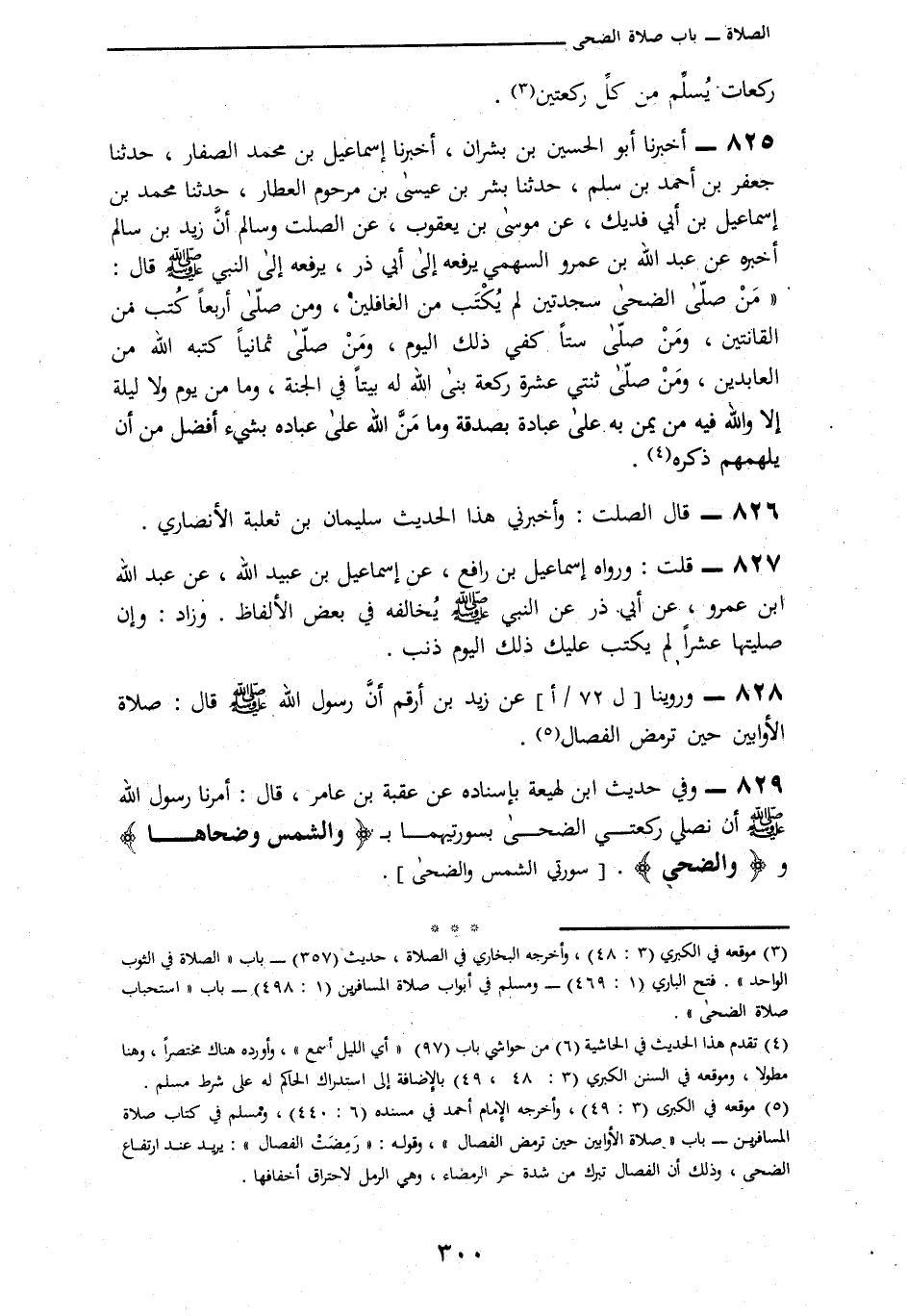 825 - أَخْبَرَنَا أَبُو الْحُسَيْنِ بْنُ بِشْرَانَ، أنا إِسْمَاعِيلُ بْنُ مُحَمَّدٍ الصَّفَّارُ، نا جَعْفَرُ بْنُ أَحْمَدَ بْنِ سُلَيْمٍ، نا بِشْرُ بْنُ عِيسَى بْنِ مَرْحُومٍ الْعَطَّارُ، نا مُحَمَّدُ بْنُ إِسْمَاعِيلَ بْنِ أَبِي فُدَيْكٍ، عَنْ مُوسَى بْنِ يَعْقُوبَ، عَنِ الصَّلْتِ بْنِ سَالِمٍ، أَنَّ زَيْدَ بْنَ سَالِمٍ، أَخْبَرَهُ عَنْ عَبْدِ اللَّهِ بْنِ عَمْرٍو السَّهْمِيِّ، يَرْفَعْهُ إِلَى أَبِي ذَرٍّ وَهُوَ يَرْفَعْهُ إِلَى النَّبِيِّ صَلَّى اللهُ عَلَيْهِ وَسَلَّمَ قَالَ: «§مَنْ صَلَّى الضُّحَى سَجْدَتَيْنِ لَمْ يُكْتَبْ مِنَ الْغَافِلِينَ، وَمَنْ صَلَّى أَرْبَعًا كُتِبَ مِنَ الْقَانِتِينَ، وَمَنْ صَلَّى سِتًّا كُفِيَ ذَلِكَ الْيَوْمِ، وَمَنْ صَلَّى ثَمَانِيًا كَتَبَهُ اللَّهُ مِنَ الْعَابِدِينَ، وَمَنْ صَلَّى ثِنْتَيْ عَشْرَةَ رَكْعَةً بَنَى اللَّهُ لَهُ بَيْتًا فِي الْجَنَّةِ، وَمَا مِنْ يَوْمٍ وَلَا لَيْلَةٍ إِلَّا وَلِلَّهِ فِيهِ مِنَنٌ يَمُنُّ بِهِ عَلَى عِبَادِهِ بِصَدَقَةٍ، وَمَا مَنَّ اللَّهُ عَلَى عِبَادِهِ بِشَيْءٍ أَفْضَلَ مِنْ أَنْ يُلْهِمَهُمْ ذِكْرَهُ»