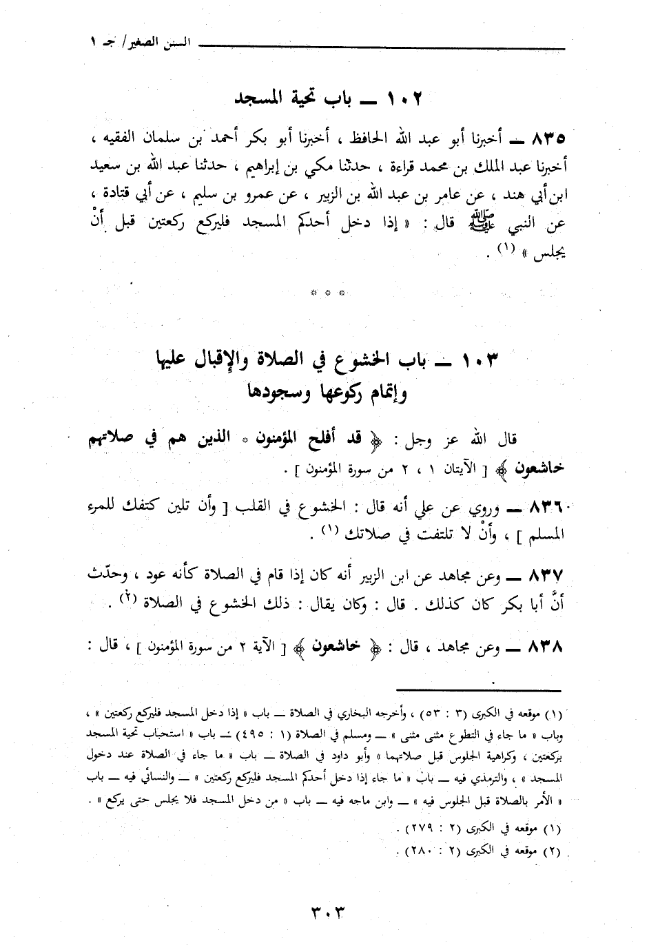 838 - وَعَنْ مُجَاهِدٍ، {خَاشِعُونَ} [المؤمنون: 2] قَالَ -[302]-: هُوَ السُّكُونُ فِيهَا