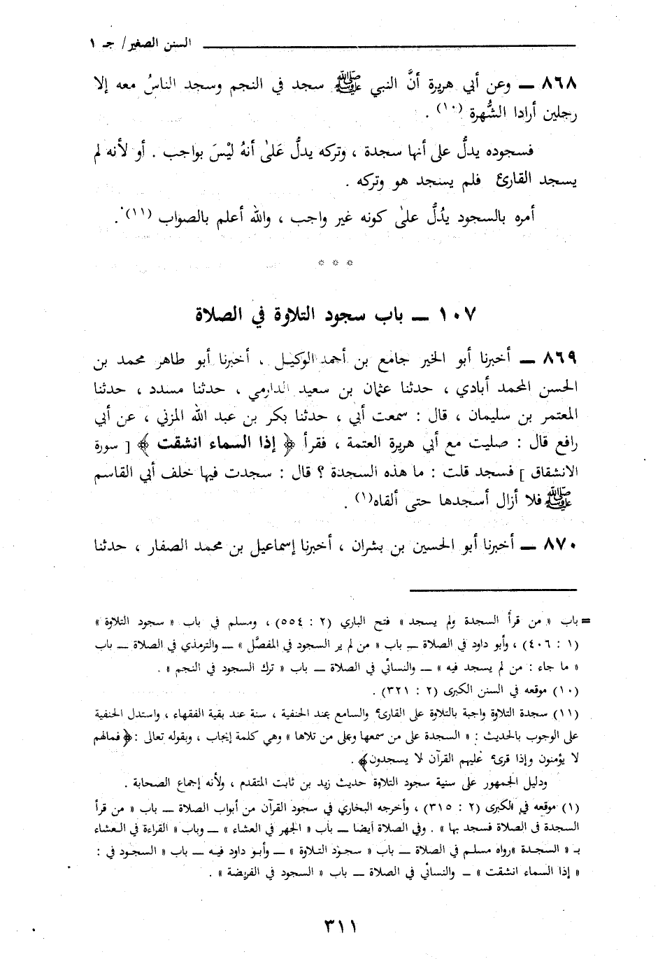 868 - وَعَنْ أَبِي هُرَيْرَةَ، أَنَّ النَّبِيَّ صَلَّى اللهُ عَلَيْهِ وَسَلَّمَ «§سَجَدَ فِي النَّجْمِ، وَسَجَدَ النَّاسُ مَعَهُ إِلَّا رَجُلَيْنِ أَرَادَا الشُّهْرَةَ فَسُجُودُهُ يَدُلُّ عَلَى أَنَّهَا سَجْدَةٌ وَتَرْكُهُ يَدُلُّ عَلَى أَنَّهُ لَيْسَ بِوَاجِبٍ أَوْ لِأَنَّهُ لَمْ يَسْجُدِ الْقَارِئُ، فَلَمْ يَسْجُدْ هُوَ وَتَرْكُهُ أَمْرَهُ بِالسُّجُودِ يَدُلُّ عَلَى كَوْنِهِ غَيْرَ وَاجِبٍ»، وَاللَّهُ أَعْلَمُ بِالصَّوَابِ