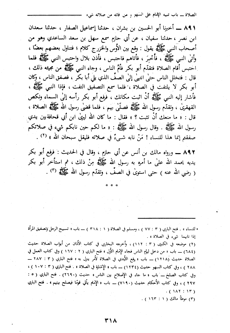 891 - أنا أَبُو الْحُسَيْنِ بْنُ بِشْرَانَ، نا إِسْمَاعِيلُ الصَّفَّارُ، نا سَعْدَانُ بْنُ نَصْرٍ، نا سُفْيَانُ، عَنْ أَبِي حَازِمٍ، سَمِعَ سَهْلَ بْنَ سَعْدٍ السَّاعِدِيَّ، وَهُوَ مِنْ أَصْحَابِ النَّبِيِّ صَلَّى اللهُ عَلَيْهِ وَسَلَّمَ يَقُولُ: وَقَعَ بَيْنَ الْأَوْسِ وَالْخَزْرَجِ كَلَامٌ فَتَنَاوَلَ بَعْضُهُمْ بَعْضًا فَأَتَى النَّبِيَّ صَلَّى اللهُ عَلَيْهِ وَسَلَّمَ فَأَخْبَرَهُ فَأَتَاهُمْ فَاحْتَبَسَ فَأَذَّنَ بِلَالٌ وَاحْتَبَسَ النَّبِيُّ صَلَّى اللهُ عَلَيْهِ وَسَلَّمَ فَلَمَّا احْتَبَسَ أَقَامَ الصَّلَاةَ فَتَقَدَّمَ أَبُو بَكْرٍ فَأَمَّ النَّاسَ وَجَاءَ النَّبِيُّ صَلَّى اللهُ عَلَيْهِ وَسَلَّمَ مِنْ مَجِيئِهِ ذَلِكَ قَالَ: فَتَخَلَّلَ النَّاسَ حَتَّى انْتَهَى إِلَى الصَّفِّ الَّذِي يَلِي أَبَا بَكْرٍ فَصَفَّقَ النَّاسُ، وَكَانَ أَبُو بَكْرٍ لَا يَلْتَفِتُ فِي الصَّلَاةِ فَلَمَّا سَمِعَ التَّصْفِيقَ الْتَفَتَ، فَإِذَا النَّبِيُّ صَلَّى اللهُ عَلَيْهِ وَسَلَّمَ فَأَشَارَ إِلَيْهِ النَّبِيُّ صَلَّى اللهُ عَلَيْهِ وَسَلَّمَ أَنِ اثْبُتْ مَكَانَكَ، فَرَفَعَ أَبُو بَكْرٍ رَأْسَهُ إِلَى السَّمَاءِ وَنَكَصَ الْقَهْقَرَى، وَتَقَدَّمَ رَسُولُ اللَّهِ صَلَّى اللهُ عَلَيْهِ وَسَلَّمَ فَصَلَّى بِهِمْ فَلَمَّا قَضَى رَسُولُ اللَّهِ صَلَّى اللهُ عَلَيْهِ وَسَلَّمَ الصَّلَاةَ قَالَ: «مَا مَنَعَكَ أَنْ تَثْبُتَ؟»، فَقَالَ: مَا كَانَ اللَّهُ لِيَرَى ابْنَ أَبِي قُحَافَةَ بَيْنَ يَدَيْ رَسُولِ اللَّهِ صَلَّى اللهُ عَلَيْهِ وَسَلَّمَ، وَقَالَ رَسُولُ اللَّهِ صَلَّى اللهُ عَلَيْهِ وَسَلَّمَ: «§مَا لَكُمْ حِينَ نَابَكُمْ شَيْءٌ فِي صَلَاتِكُمْ صَفَّقْتُمْ إِنَّمَا هَذَا لِلنِّسَاءِ، مَنْ نَابَهُ شَيْءٌ فِي صَلَاتِهِ فَلْيَقُلْ سُبْحَانَ اللَّهِ»