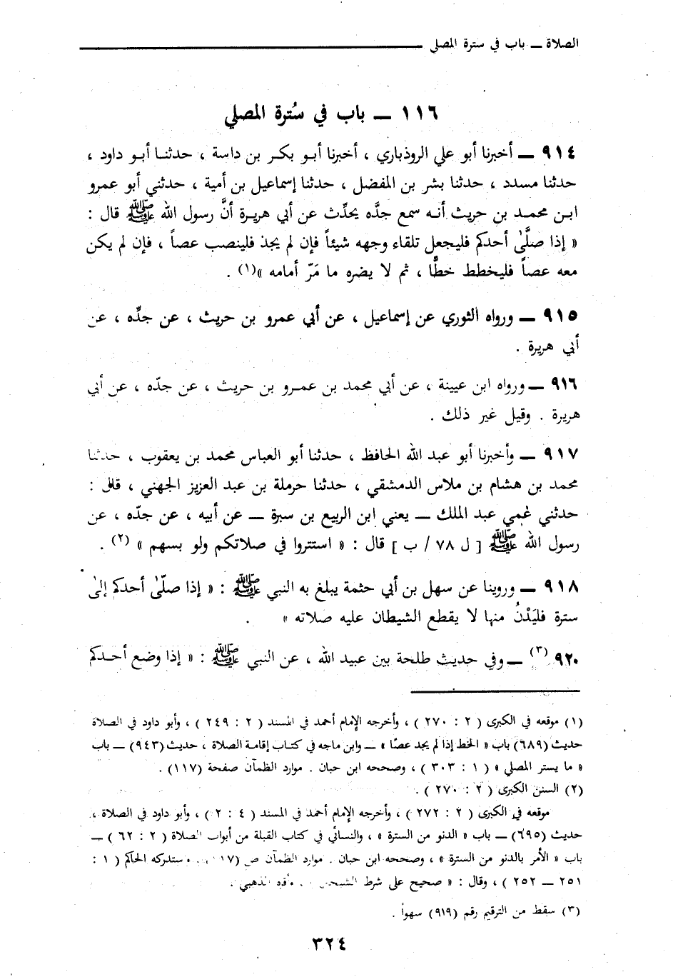 920 - وَفِي حَدِيثِ طَلْحَةَ بْنِ عُبَيْدِ اللَّهِ، عَنِ النَّبِيِّ صَلَّى اللهُ عَلَيْهِ وَسَلَّمَ: § «إِذَا وَضَعَ أَحَدُكُمْ -[323]- بَيْنَ يَدَيْهِ مِثْلَ مُؤْخِرَةِ الرَّحْلِ فَلْيُصَلِّ وَلَا يُبَالِي مَنْ يَمُرُّ وَرَاءَ ذَلِكَ» وَفِي رِوَايَةٍ أُخْرَى «فَلَا يَضُرَّهُ مَنْ مَرِّ مِنْ وَرَاءِ ذَلِكَ»