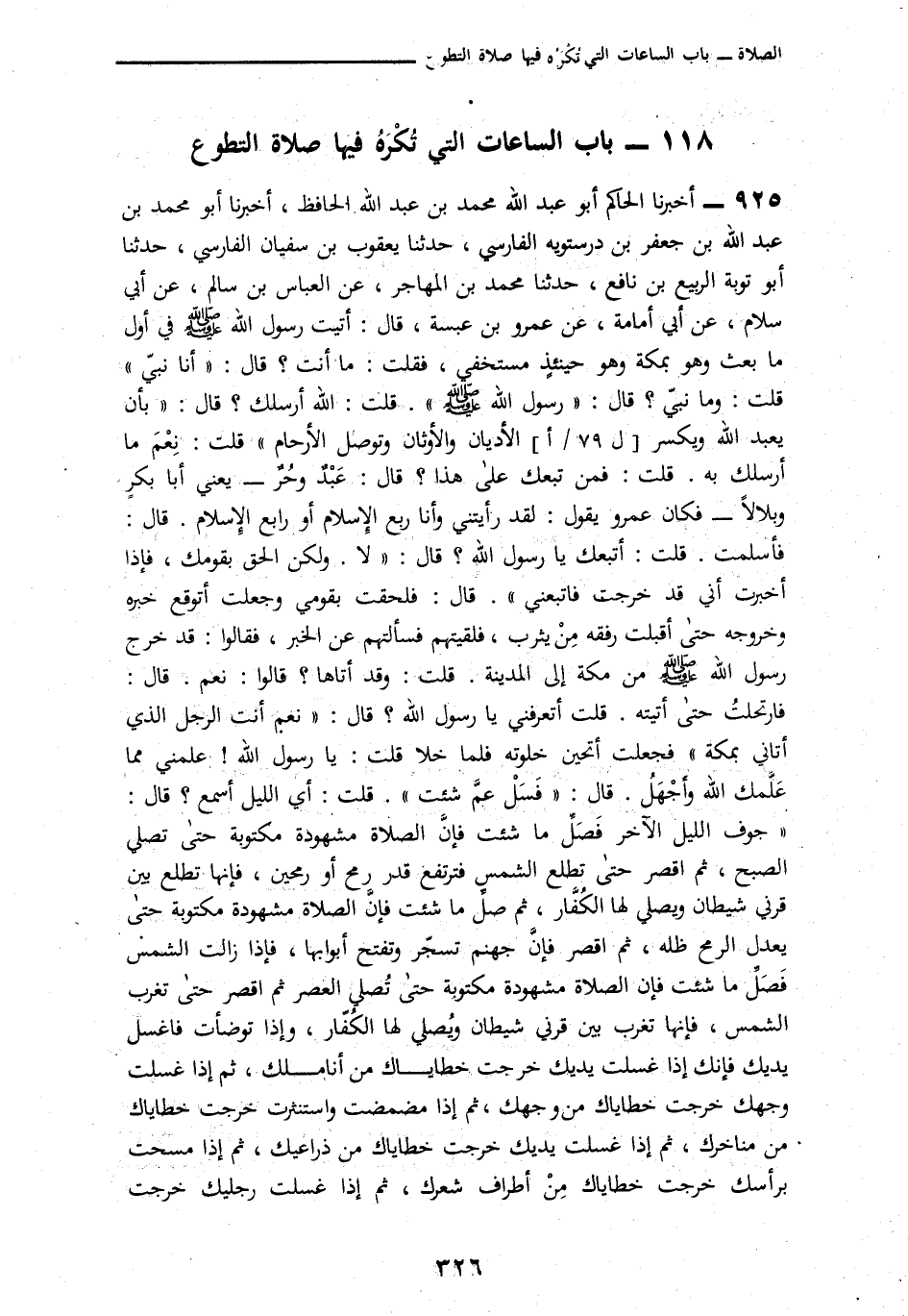 925 - أَخْبَرَنَا الْحَاكِمُ أَبُو عَبْدِ اللَّهِ مُحَمَّدُ بْنُ عَبْدِ اللَّهِ الْحَافِظُ، أنا أَبُو مُحَمَّدٍ عَبْدُ اللَّهِ بْنُ جَعْفَرِ بْنِ دَرَسْتَوَيْهِ الْفَارِسِيُّ، نا يَعْقُوبُ بْنُ سُفْيَانَ الْفَارِسِيُّ، نا أَبُو تَوْبَةَ الرَّبِيعُ بْنُ نَافِعٍ، نا مُحَمَّدُ بْنُ الْمُهَاجِرِ، عَنِ الْعَبَّاسِ بْنِ سَالِمٍ، عَنْ أَبِي سَلَّامٍ، عَنْ أَبِي أُمَامَةَ، عَنْ عَمْرِو بْنِ عَبَسَةَ، قَالَ: أَتَيْتُ رَسُولَ اللَّهِ صَلَّى اللهُ عَلَيْهِ وَسَلَّمَ فِي أَوَّلِ مَا بُعِثَ وَهُوَ بِمَكَّةَ وَهُوَ حِينَئِذٍ مُسْتَخْفٍ فَقُلْتُ: مَا أَنْتَ؟ قَالَ: «أنا نَبِيُّ» قُلْتُ: وَمَا نَبِيُّ؟ قَالَ: «رَسُولُ اللَّهِ» قُلْتُ: اللَّهُ أَرْسَلَكَ؟ قَالَ: «نَعَمْ» قُلْتُ: بِمَا أَرْسَلَكَ؟ قَالَ: «بِأَنْ تَعْبُدَ اللَّهَ وَتَكْسِرَ الْأَدْيَانَ وَالْأَوْثَانَ وَتُوَصِّلَ الْأَرْحَامَ» قُلْتُ: نِعْمَ مَا أَرْسَلَكَ بِهِ، قُلْتُ: فَمَنْ يَتَّبِعُكَ عَلَى هَذَا؟ قَالَ: «عَبْدٌ وَحُرٌّ» يَعْنِي أَبَا بَكْرٍ وَبِلَالًا، فَكَانَ عَمْرٌو يَقُولُ: لَقَدْ رَأَيْتُنِي وَأَنَا رُبُعُ الْإِسْلَامِ أَوْ رَابِعُ الْإِسْلَامِ قَالَ: فَأَسْلَمْتُ، قُلْتُ: أَتَّبِعُكَ يَا رَسُولَ اللَّهِ. قَالَ: «لَا، وَلَكِنِ الْحَقْ بِقَوْمِكَ فَإِذَا أُخْبِرْتُ أَنِّي قَدْ خَرَجْتُ فَاتَّبِعْنِي» قَالَ: فَلَحِقْتُ بِقَوْمِي وَجَعَلْتُ أَتَوَقَّعُ خَبَرَهُ وَخُرُوجَهُ حَتَّى أَقْبَلِتْ رُفْقَةٌ مِنْ يَثْرِبَ فَلَقِيتُهُمْ فَسَأَلْتُهُمْ عَنِ الْخَبَرِ فَقَالُوا: قَدْ خَرَجَ رَسُولُ اللَّهِ صَلَّى اللهُ عَلَيْهِ وَسَلَّمَ مِنْ مَكَّةَ إِلَى الْمَدِينَةَ قُلْتُ: وَقَدْ أَتَاهَا؟ قَالُوا: نَعَمْ. قَالَ: فَارْتَحَلْتُ حَتَّى أَتَيْتُهُ قُلْتُ: أَتَعْرِفُنِي يَا رَسُولَ اللَّهِ؟ قَالَ: «نَعَمْ، أَنْتَ الرَّجُلُ الَّذِي أَتَانِي بِمَكَّةَ» فَجَعَلْتُ أَتَجَسَّسُ خَلْوَتَهُ فَلَمَّا خَلَا قُلْتُ: يَا رَسُولَ اللَّهِ، عَلِّمْنِي مِمَّا عَلَّمَكَ اللَّهُ وَأَجْمِلْ. قَالَ: «فَسَلْ عَمَّا شِئْتَ» قُلْتُ: §أَيُّ اللَّيْلِ أَسْمَعُ؟ قَالَ: «جَوْفُ اللَّيْلِ الْآخِرِ، فَصَلِّ مَا شِئْتَ فَإِنَّ الصَّلَاةَ مَشْهُودَةٌ مَكْتُوبَةٌ حَتَّى تُصَلِّيَ الصُّبْحَ ثُمَّ أَقْصِرْ حَتَّى تَطْلُعَ الشَّمْسُ فَتَرْتَفِعَ قَيْدَ رُمْحٍ أَوْ رُمْحَيْنِ فَإِنَّهَا تَطْلُعُ بَيْنَ قَرْنَيْ شَيْطَانٍ وَيُصَلِّي لَهَا الْكُفَّارُ، ثُمَّ صَلِّ مَا شِئْتَ فَإِنَّ الصَّلَاةَ مَشْهُودَةٌ مَكْتُوبَةٌ حَتَّى يَعْدِلَ الرُّمْحَ ظِلُّهُ ثُمَّ أَقْصِرْ فَإِنَّ جَهَنَّمَ تُسْجَرُ وَتُفْتَحُ أَبْوَابُهَا فَإِذَا زَالَتِ الشَّمْسُ فَصَلِّ مَا شِئْتَ فَإِنَّ الصَّلَاةَ مَشْهُودَةٌ مَكْتُوبَةٌ حَتَّى تُصَلِّيَ الْعَصْرَ، ثُمَّ أَقْصِرْ حَتَّى تَغْرُبَ الشَّمْسُ فَإِنَّهَا تَغْرُبُ الشَّمْسُ بَيْنَ قَرْنَيْ شَيْطَانٍ وَيُصَلِّي لَهَا الْكُفَّارُ، وَإِذَا تَوَضَّأَتَ فَاغْسِلْ يَدَيْكَ فَإِنَّكَ إِذَا غَسَلْتَ يَدَيْكَ خَرَجَتْ خَطَايَاكَ مِنْ أَنَامِلِكَ، ثُمَّ إِذَا غَسَلْتَ وَجْهَكَ خَرَجَتْ خَطَايَاكَ مِنْ وَجْهِكَ، ثُمَّ إِذَا مَضْمَضْتَ وَاسْتَنْثَرَتْ خَرَجَتْ خَطَايَاكَ مِنْ مَنَاخِرِكَ، ثُمَّ إِذَا غَسَلْتَ يَدَيْكَ خَرَجَتْ خَطَايَاكَ مِنْ ذِرَاعَيْكَ ثُمَّ إِذَا مَسَحْتَ بِرَأْسِكَ خَرَجَتْ خَطَايَاكَ مِنْ أَطْرَافِ شَعْرِكَ ثُمَّ إِذَا غَسَلْتَ رِجْلَيْكَ خَرَجَتْ -[325]- خَطَايَاكَ مِنْ رِجْلَيْكَ، فَإِنْ ثَبَتَّ فِي مَجْلِسِكَ كَانَ لَكَ حَظُّكَ مِنْ وُضُوئِكَ وَإِنْ قُمْتَ وَذَكَرْتَ رَبَّكَ وَحَمِدْتَهُ وَرَكَعْتَ رَكْعَتَيْنِ مُقْبِلًا عَلَيْهِمَا بِقَلْبِكِ كُنْتَ مِنْ خَطَايَاكَ كَيَوْمِ وَلَدَتْكَ أُمُّكَ» قَالَ: قُلْ