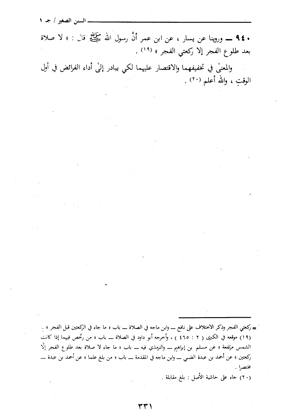 940 - وَرُوِّينَا عَنْ يَسَارٍ، عَنِ ابْنِ عُمَرَ، أَنَّ رَسُولَ اللَّهِ صَلَّى اللهُ عَلَيْهِ وَسَلَّمَ قَالَ: § «لَا صَلَاةَ بَعْدَ طُلُوعِ الْفَجْرِ إِلَّا رَكْعَتَيِ الْفَجْرِ» وَالْمَعْنَى فِي تَخْفِيفِهِمَا وَالِاقْتِصَارِ عَلَيْهِمَا لِكَيْ يُبَادَرَ إِلَى أَدَاءِ الْفَرْضِ فِي أَوَّلِ الْوَقْتِ، وَاللَّهُ أَعْلَمُ