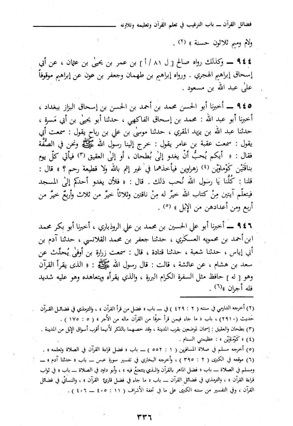 945 - أنا أَبُو الْحَسَنِ مُحَمَّدُ بْنُ أَحْمَدَ بْنِ الْحَسَنِ بْنِ إِسْحَاقَ الْبَزَّازُ بِبَغْدَادَ، أنا أَبُو عَبْدِ اللَّهِ مُحَمَّدُ بْنُ إِسْحَاقَ الْفَاكِهِيُّ، نا أَبُو يَحْيَى بْنُ أَبِي مَسَرَّةَ، نا عَبْدُ اللَّهِ بْنُ يَزِيدَ الْمُقْرِي، نا مُوسَى بْنُ عَلِيِّ بْنِ رَبَاحٍ، يَقُولُ: سَمِعْتُ أَبِيَ يَقُولُ: سَمِعْتُ عُقْبَةَ بْنَ عَامِرٍ، يَقُولُ: خَرَجَ إِلَيْنَا رَسُولُ اللَّهِ صَلَّى اللهُ عَلَيْهِ وَسَلَّمَ وَنَحْنُ فِي الصُّفَّةِ فَقَالَ: «أَيُّكُمْ يُحِبُّ أَنْ يَغْدُوَ إِلَى بُطْحَانَ أَوْ إِلَى الْعَقِيقِ فَيَأْتِيَ كُلَّ يَوْمٍ بِنَاقَتَيْنِ كَوْمَاوَيْنِ زَهْرَاوَيْنِ فَيَأْخُذَهُمَا فِي غَيْرِ إِثْمٍ بِاللَّهِ وَلَا قَطِيعَةِ رَحِمٍ؟» قَالَ: كُلُّنَا يَا رَسُولَ اللَّهِ، نُحِبُّ ذَلِكَ، قَالَ: § «فَلَأَنْ يَغْدُوَ أَحَدُكُمْ إِلَى الْمَسْجِدِ فَيَتَعَلَّمَ آيَتَيْنِ مِنْ كِتَابِ اللَّهِ خَيْرٌ لَهُ مِنْ نَاقَتَيْنِ وَثَلَاثٌ خَيْرٌ مِنْ ثَلَاثٍ وَأَرْبَعٌ خَيْرٌ مِنْ أَرْبَعٍ وَمِنْ أَعْدَادِهِنَّ مِنَ الْإِبِلِ»