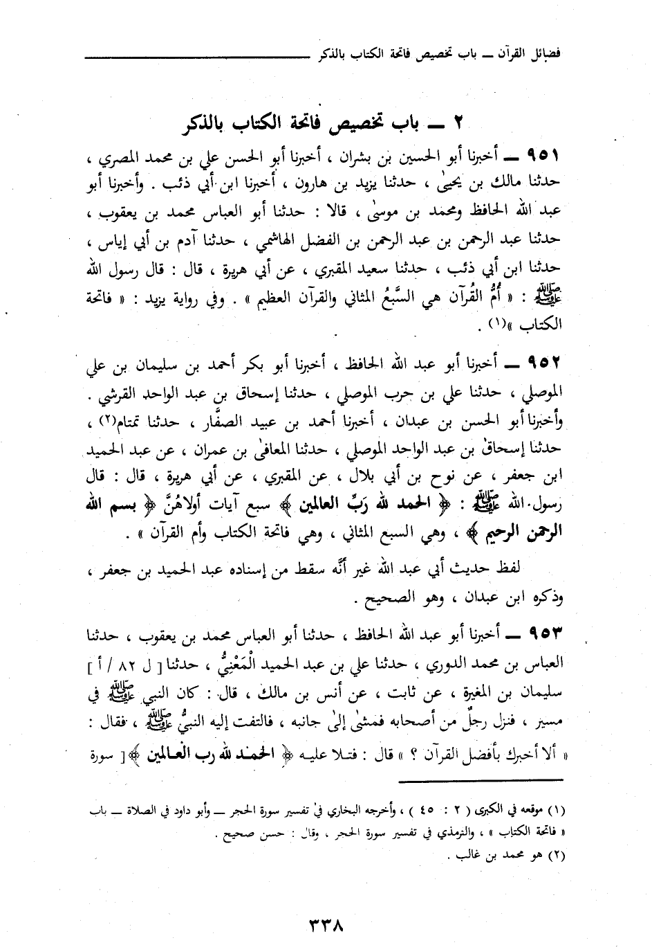 951 - أَخْبَرَنَا أَبُو الْحُسَيْنِ بْنُ بِشْرَانَ، أنا أَبُو الْحَسَنِ عَلِيُّ بْنُ مُحَمَّدٍ الْمِصْرِيُّ، نا مَالِكُ بْنُ يَحْيَى، نا يَزِيدُ بْنُ هَارُونَ، أنا ابْنُ أَبِي ذِئْبٍ، وَأَخْبَرَنَا أَبُو عَبْدِ اللَّهِ الْحَافِظُ، وَمُحَمَّدُ بْنُ مُوسَى، قَالَا: نا أَبُو الْعَبَّاسِ مُحَمَّدُ بْنُ يَعْقُوبَ، نا عَبْدُ الرَّحْمَنِ بْنُ عَبْدِ الرَّحْمَنِ بْنِ الْفَضْلِ الْهَاشِمِيُّ، نا آدَمُ بْنُ أَبِي إِيَاسَ، نا ابْنُ أَبِي ذِئْبٍ، نا سَعِيدٌ الْمَقْبُرِيُّ، عَنْ أَبِي هُرَيْرَةَ، قَالَ: قَالَ رَسُولُ اللَّهِ صَلَّى اللهُ عَلَيْهِ وَسَلَّمَ: § «أُمُّ الْقُرْآنِ هِيَ السَّبْعُ الْمَثَانِي وَالْقُرْآنُ الْعَظِيمُ» وَفِي رِوَايَةِ يَزِيدَ: «فَاتِحَةُ الْكِتَابِ»