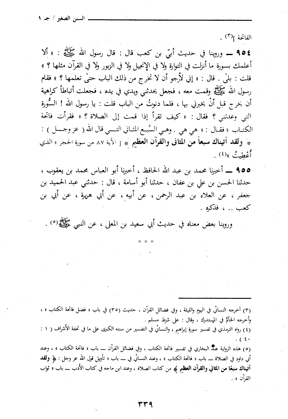 954 - وَرُوِّينَا فِي حَدِيثِ أُبَيِّ بْنِ كَعْبٍ قَالَ: قَالَ رَسُولُ اللَّهِ صَلَّى اللهُ عَلَيْهِ وَسَلَّمَ: § «أَلَا أُعَلِّمُكَ بِسُورَةٍ مَا أُنْزِلَتْ فِي التَّوْرَاةِ وَلَا فِي الْإِنْجِيلِ وَلَا فِي الزَّبُورِ وَلَا فِي الْقُرْآنِ مِثْلُهَا؟» قُلْتُ: بَلَى، قَالَ: «إِنِّي لَأَرْجُو أَلَّا تَخْرُجَ مِنْ ذَلِكَ الْبَابِ حَتَّى تَعْلَمَهَا»، فَقَامَ رَسُولُ اللَّهِ صَلَّى اللهُ عَلَيْهِ وَسَلَّمَ وَقُمْتُ مَعَهُ فَجَعَلَ يُحَدِّثُنِي وَيَدِي فِي يَدِهِ فَجَعَلْتُ أَتَبَاطَأُ كَرَاهِيَةَ أَنْ يَخْرُجَ قَبْلَ أَنْ يُخْبِرَنِيَ بِهَا فَلَمَّا دَنَوْتُ مِنَ الْبَابِ قُلْتُ: يَا رَسُولَ اللَّهِ، السُّورَةُ الَّتِي وَعَدْتَنِي، فَقَالَ: «كَيْفَ تَقْرَأُ إِذَا قُمْتَ إِلَى الصَّلَاةَ؟» فَقَرَأْتُ فَاتِحَةَ الْكِتَابِ، فَقَالَ: " هِيَ هِيَ وَهِيَ السَّبْعُ الْمَثَانِي الَّتِي قَالَ اللَّهُ عَزَّ وَجَلَّ {وَلَقَدْ آتَيْنَاكَ سَبْعًا مِنَ الْمَثَانِي وَالْقُرْآنَ الْعَظِيمَ} [الحجر: 87] الَّذِي أُعْطِيتُ "