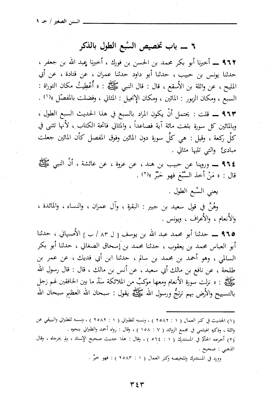 964 - وَرُوِّينَا عَنْ حَبِيبِ بْنِ هِنْدٍ، عَنْ عُرْوَةَ، عَنْ عَائِشَةَ، أَنَّ النَّبِيَّ صَلَّى اللهُ عَلَيْهِ وَسَلَّمَ قَالَ: § «مَنْ أَخَذَ السَّبْعَ فَهُوَ حَبْرٌ» - يَعْنِي السَّبْعَ الطِّوَالَ -، وَهُنَّ فِي قَوْلِ سَعِيدِ بْنِ جُبَيْرٍ، الْبَقَرَةُ، وَآلُ عِمْرَانَ، وَالنِّسَاءُ وَالْمَائِدَةُ، وَالْأَنْعَامُ، وَالْأَعْرَافُ، وَيُونُسُ