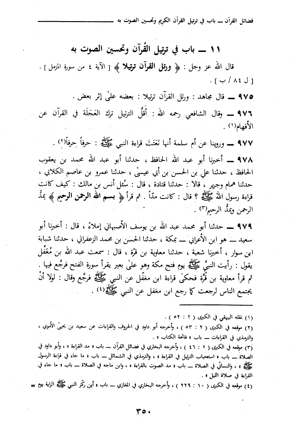 977 - وَرُوِّينَا عَنْ أُمِّ سَلَمَةَ، «أَنَّهَا §نَعَتَتْ قِرَاءَةَ النَّبِيِّ صَلَّى اللهُ عَلَيْهِ وَسَلَّمَ حَرْفًا حَرْفًا»