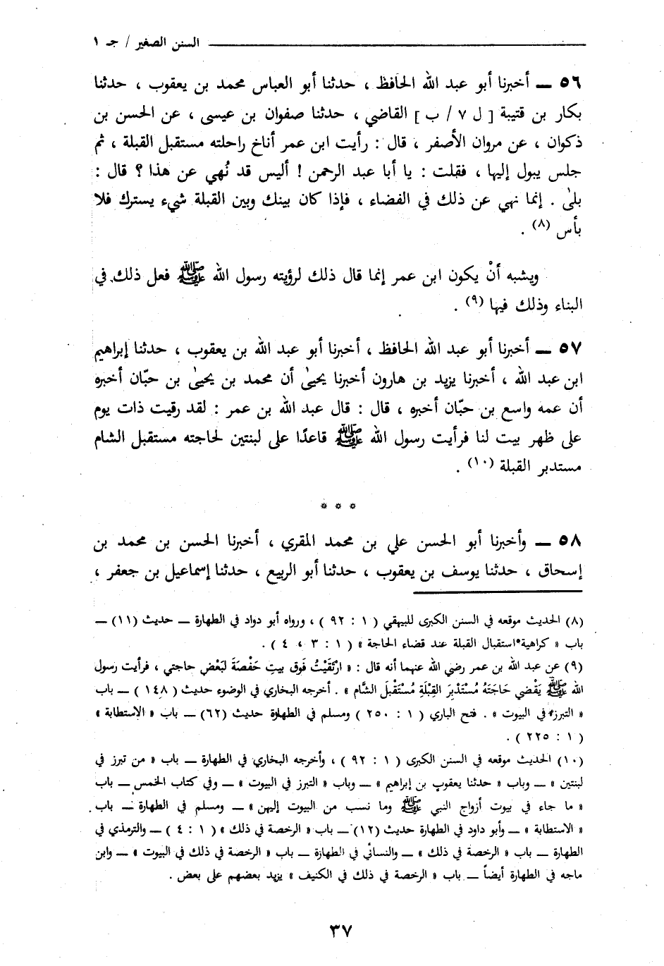 56 - لَمَّا أَخْبَرَنَا أَبُو عَبْدِ اللَّهِ الْحَافِظُ، نا أَبُو الْعَبَّاسِ مُحَمَّدُ بْنُ يَعْقُوبَ، نا بَكَّارُ بْنُ قُتَيْبَةَ الْقَاضِي، نا صَفْوَانُ بْنُ عِيسَى، عَنِ الْحَسَنِ بْنِ ذَكْوَانَ، عَنْ مَرْوَانَ الْأَصْفَرِ، قَالَ: رَأَيْتُ ابْنَ عُمَرَ أَنَاخَ رَاحِلَتَهُ مُسْتَقْبِلَ الْقِبْلَةِ ثُمَّ جَلَسَ يَبُولُ إِلَيْهَا فَقُلْتُ: يَا أَبَا عَبْدِ الرَّحْمَنِ، أَلَيْسَ قَدْ نُهِيَ عَنْ هَذَا؟ قَالَ: بَلَى، إِنَّمَا § «نُهِيَ عَنْ ذَلِكَ فِي الْفَضَاءِ فَإِذَا كَانَ بَيْنَكَ وَبَيْنَ الْقِبْلَةِ شَيْءٌ يَسْتُرُكَ فَلَا بَأْسَ. وَيُشْبِهُ أَنْ يَكُونَ ابْنُ عُمَرَ إِنَّمَا قَالَ ذَلِكَ لِرُؤْيَتِهِ لِرَسُولِ اللَّهِ صَلَّى اللهُ عَلَيْهِ وَسَلَّمَ فَعَلَ ذَلِكَ فِي الْبِنَاءِ»