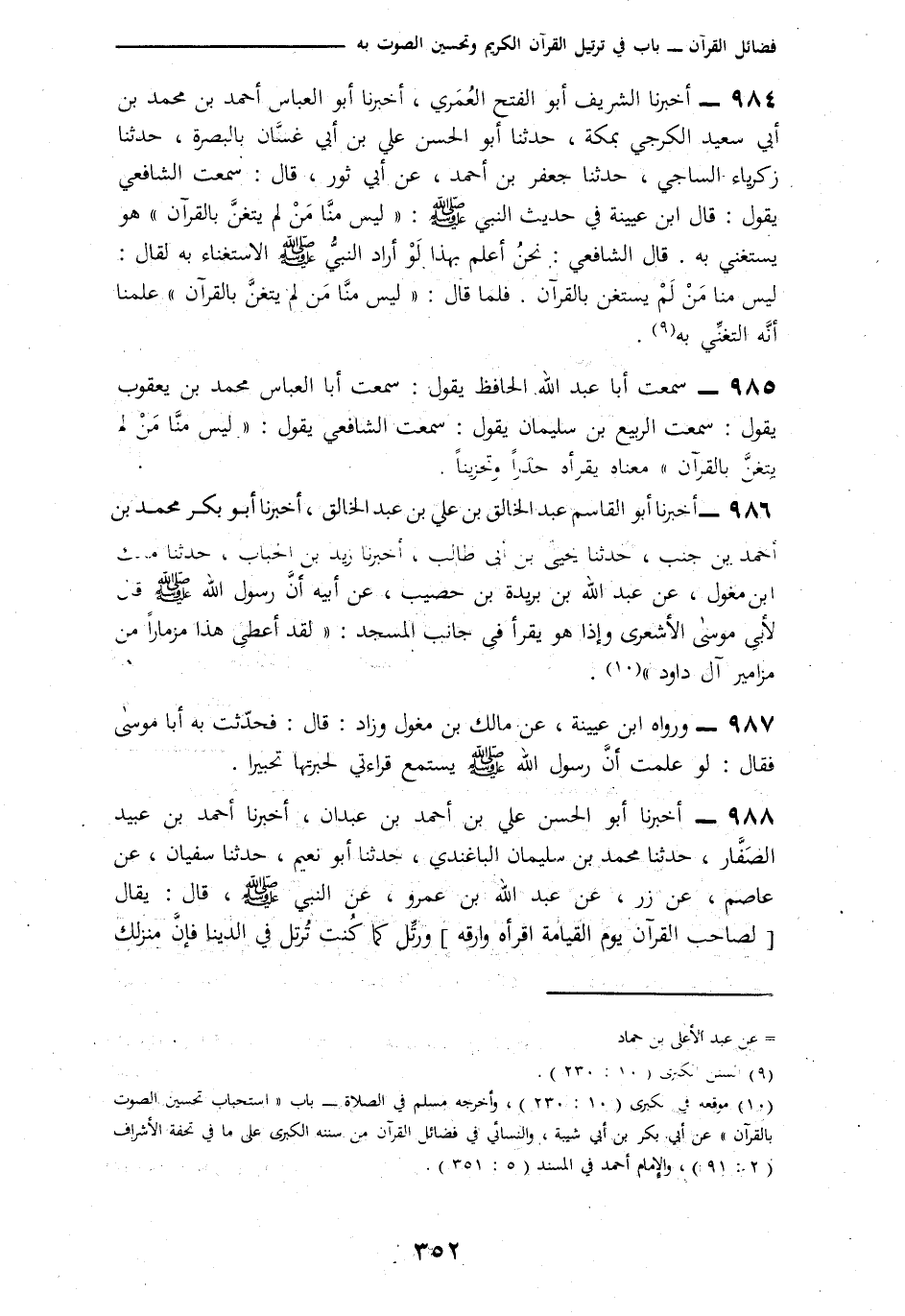 985 - سَمِعْتُ أَبَا عَبْدِ اللَّهِ الْحَافِظُ، يَقُولُ: سَمِعْتُ أَبَا الْعَبَّاسِ مُحَمَّدَ بْنَ يَعْقُوبَ يَقُولُ: سَمِعْتُ الرَّبِيعَ بْنَ سُلَيْمَانَ، يَقُولُ: سَمِعْتُ الشَّافِعِيَّ، يَقُولُ: § «لَيْسَ مِنَّا مَنْ لَمْ يَتَغَنَّ بِالْقُرْآنِ» مَعْنَاهُ يَقْرَؤُهُ حَدْرًا وَتَحْزِينًا