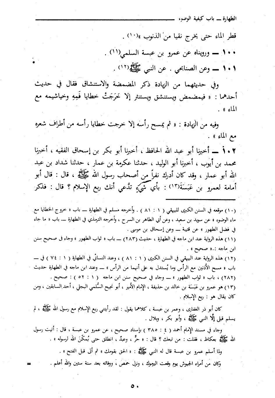 102 - أَخْبَرَنَا أَبُو عَبْدِ اللَّهِ الْحَافِظُ، أنا أَبُو بَكْرِ بْنُ إِسْحَاقَ الْفَقِيهُ، أنا مُحَمَّدُ بْنُ أَيُّوبَ، أنا أَبُو الْوَلِيدِ، نا عِكْرِمَةُ بْنُ عَمَّارٍ، نا شَدَّادُ بْنُ عَبْدِ اللَّهِ أَبُو عَمَّارٍ - وَقَدْ كَانَ أَدْرَكَ نَفَرًا مِنْ أَصْحَابِ رَسُولِ اللَّهِ صَلَّى اللهُ عَلَيْهِ وَسَلَّمَ - قَالَ أَبُو أُمَامَةَ لِعَمْرِو بْنِ عَبَسَةَ: بِأَيِّ شَيْءٍ تَدَّعِي أَنَّكَ رَابِعُ الْإِسْلَامِ؟ قَالَ: فَذَكَرَ -[49]- الْحَدِيثَ وَقَالَ فِيهِ: قُلْتُ: يَا رَسُولَ اللَّهِ، أَخْبِرْنِي عَنِ الْوُضُوءِ. فَقَالَ: «§مَا مِنْكُمْ مِنْ رَجُلٍ يَقْرَبُ وَضُوءَهُ ثُمَّ يُمَضْمِضُ، وَيَسْتَنْشِقُ، وَيَسْتَنْثِرُ إِلَّا خَرَجَتْ خَطَايَا فَمِهِ وَخَيَاشِمِهِ مَعَ الْمَاءِ، ثُمَّ يَغْسِلُ وَجْهَهُ كَمَا أَمَرَهُ اللَّهُ، إِلَّا خَرَجَتْ خَطَايَا وَجْهِهِ مِنْ أَطْرَافِ لِحْيَتِهِ مَعَ الْمَاءِ، ثُمَّ يَغْسِلُ يَدَيْهِ إِلَى الْمِرْفَقَيْنِ إِلَّا خَرَجَتْ خَطَايَا يَدَيْهِ مِنْ أَطْرَافِ أَنَامِلِهِ مَعَ الْمَاءِ ثُمَّ يَمْسَحُ بِرَأْسِهِ إِلَّا خَرَجَتْ خَطَايَا رَأْسِهِ مِنْ أَطْرَافِ شَعْرِهِ مَعَ الْمَاءِ ثُمَّ يَغْسِلُ قَدَمَيْهِ إِلَى الْكَعْبَيْنِ كَمَا أَمَرَهُ اللَّهُ عَزَّ وَجَلَّ إِلَّا خَرَجَتْ خَطَايَا رِجْلَيْهِ مِنْ أَطْرَافِ أَصَابِعِهِ مَعَ الْمَاءِ» وَفِي هَذَا دَلَالَةٌ عَلَى أَنَّ اللَّهَ تَعَالَى إِنَّمَا أَمَرَهُ بِغَسْلِ الرِّجْلَيْنِ حَيْثُ قَالَ: «ثُمَّ يَغْسِلُ قَدَمَيْهِ إِلَى الْكَعْبَيْنِ» كَمَا أَمَرَهُ اللَّهُ تَعَالَى
